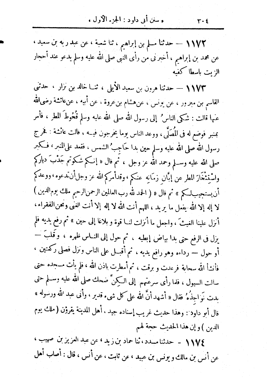 1173 - حَدَّثَنَا هَارُونُ بْنُ سَعِيدٍ الْأَيْلِيُّ، حَدَّثَنَا خَالِدُ بْنُ نِزَارٍ، حَدَّثَنِي الْقَاسِمُ بْنُ مَبْرُورٍ، عَنْ يُونُسَ، عَنْ هِشَامِ بْنِ عُرْوَةَ، عَنْ أَبِيهِ، عَنْ عَائِشَةَ، رَضِيَ اللَّهُ عَنْهَا قَالَتْ: شَكَا النَّاسُ إِلَى رَسُولِ اللَّهِ صَلَّى اللهُ عَلَيْهِ وَسَلَّمَ قُحُوطَ الْمَطَرِ، فَأَمَرَ بِمِنْبَرٍ، فَوُضِعَ لَهُ فِي الْمُصَلَّى، وَوَعَدَ النَّاسَ يَوْمًا يَخْرُجُونَ فِيهِ، قَالَتْ عَائِشَةُ: فَخَرَجَ رَسُولُ اللَّهِ صَلَّى اللهُ عَلَيْهِ وَسَلَّمَ، حِينَ بَدَا حَاجِبُ الشَّمْسِ، فَقَعَدَ عَلَى الْمِنْبَرِ، فَكَبَّرَ صَلَّى اللهُ عَلَيْهِ وَسَلَّمَ، وَحَمِدَ اللَّهَ عَزَّ وَجَلَّ، ثُمَّ قَالَ: «إِنَّكُمْ شَكَوْتُمْ جَدْبَ دِيَارِكُمْ، وَاسْتِئْخَارَ الْمَطَرِ عَنْ إِبَّانِ زَمَانِهِ عَنْكُمْ، وَقَدْ أَمَرَكُمُ اللَّهُ عَزَّ وَجَلَّ أَنْ تَدْعُوهُ، وَوَعَدَكُمْ أَنْ يَسْتَجِيبَ لَكُمْ»، ثُمَّ قَالَ: «§الْحَمْدُ لِلَّهِ رَبِّ الْعَالَمِينَ الرَّحْمَنِ الرَّحِيمِ مَلِكِ يَوْمِ الدِّينِ، لَا إِلَهَ إِلَّا اللَّهُ، يَفْعَلُ مَا يُرِيدُ، اللَّهُمَّ أَنْتَ اللَّهُ، لَا إِلَهَ إِلَّا أَنْتَ الْغَنِيُّ وَنَحْنُ الْفُقَرَاءُ، أَنْزِلْ عَلَيْنَا الْغَيْثَ، وَاجْعَلْ مَا أَنْزَلْتَ لَنَا قُوَّةً وَبَلَاغًا إِلَى حِينٍ»، ثُمَّ رَفَعَ يَدَيْهِ، فَلَمْ يَزَلْ فِي الرَّفْعِ حَتَّى بَدَا بَيَاضُ إِبِطَيْهِ، ثُمَّ حَوَّلَ إِلَى النَّاسِ ظَهْرَهُ، وَقَلَبَ، أَوْ حَوَّلَ رِدَاءَهُ، وَهُوَ رَافِعٌ يَدَيْهِ، ثُمَّ أَقْبَلَ عَلَى النَّاسِ وَنَزَلَ، فَصَلَّى رَكْعَتَيْنِ، فَأَنْشَأَ اللَّهُ سَحَابَةً فَرَعَدَتْ وَبَرَقَتْ، ثُمَّ أَمْطَرَتْ بِإِذْنِ اللَّهِ، فَلَمْ يَأْتِ مَسْجِدَهُ حَتَّى سَالَتِ السُّيُولُ، فَلَمَّا رَأَى سُرْعَتَهُمْ إِلَى الْكِنِّ ضَحِكَ صَلَّى اللهُ عَلَيْهِ وَسَلَّمَ، حَتَّى بَدَتْ نَوَاجِذُهُ، فَقَالَ: «أَشْهَدُ أَنَّ اللَّهَ عَلَى كُلِّ شَيْءٍ قَدِيرٌ، وَأَنِّي عَبْدُ اللَّهِ وَرَسُولُهُ»، قَالَ أَبُو دَاوُدَ: «وَهَذَا حَدِيثٌ غَرِيبٌ، إِسْنَادُهُ جَيِّدٌ، أَهْلُ الْمَدِينَةِ يَقْرَءُونَ (مَلِكِ يَوْمِ الدِّينِ)، وَإِنَّ هَذَا الْحَدِيثَ حُجَّةٌ لَهُمْ»
