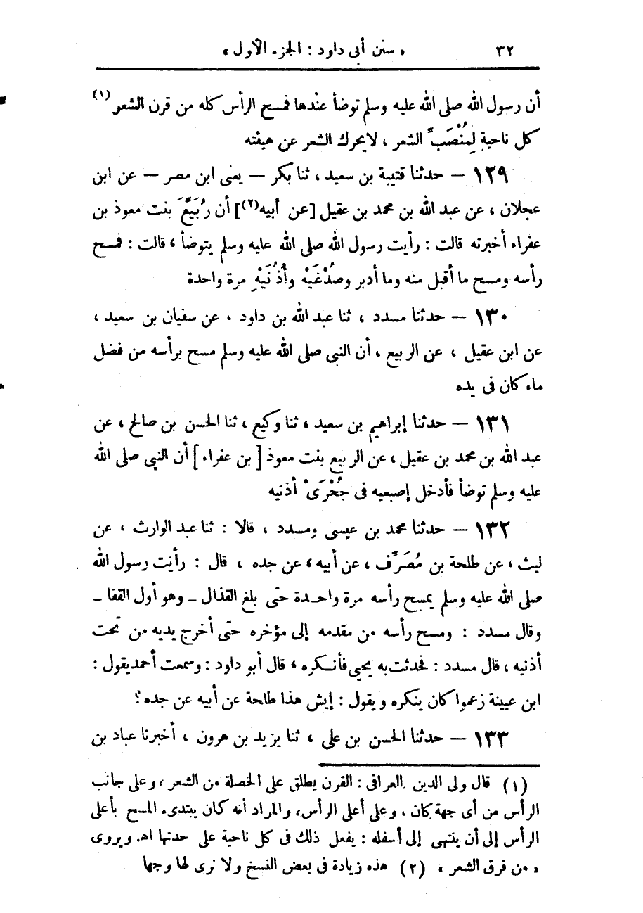 132 - حَدَّثَنَا مُحَمَّدُ بْنُ عِيسَى، وَمُسَدَّدٌ، قَالَا: حَدَّثَنَا عَبْدُ الْوَارِثِ، عَنْ لَيْثٍ، عَنْ طَلْحَةَ بْنِ مُصَرِّفٍ، عَنْ أَبِيهِ، عَنْ جَدِّهِ، قَالَ: «رَأَيْتُ رَسُولَ اللَّهِ صَلَّى اللهُ عَلَيْهِ وَسَلَّمَ §يَمْسَحُ رَأْسَهُ مَرَّةً وَاحِدَةً حَتَّى بَلَغَ الْقَذَالَ - وَهُوَ أَوَّلُ الْقَفَا، وَقَالَ مُسَدَّدٌ - مَسَحَ رَأْسَهُ مِنْ مُقَدَّمِهِ إِلَى مُؤَخَّرِهِ حَتَّى أَخْرَجَ يَدَيْهِ مِنْ تَحْتِ أُذُنَيْهِ»، قَالَ مُسَدَّدٌ: فَحَدَّثْتُ بِهِ يَحْيَى فَأَنْكَرَهُ، قَالَ أَبُو دَاوُدَ: وسَمِعْت أَحْمَدَ، يَقُولُ: «إِنَّ ابْنَ عُيَيْنَةَ زَعَمُوا أَنَّهُ كَانَ يُنْكِرُهُ، وَيَقُولُ إِيشْ هَذَا طَلْحَةُ، عَنْ أَبِيهِ، عَنْ جَدِّهِ»