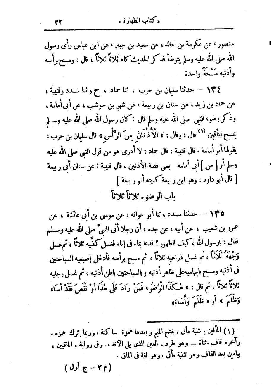 134 - حَدَّثَنَا سُلَيْمَانُ بْنُ حَرْبٍ، حَدَّثَنَا حَمَّادٌ، ح وَحَدَّثَنَا مُسَدَّدٌ، وَقُتَيْبَةُ، عَنْ حَمَّادِ بْنِ زَيْدٍ، عَنْ سِنَانِ بْنِ رَبِيعَةَ، عَنْ شَهْرِ بْنِ حَوْشَبٍ، عَنْ أَبِي أُمَامَةَ، وَذَكَرَ وُضُوءَ النَّبِيِّ صَلَّى اللهُ عَلَيْهِ وَسَلَّمَ، قَالَ: «كَانَ رَسُولُ اللَّهِ صَلَّى اللهُ عَلَيْهِ وَسَلَّمَ §يَمْسَحُ الْمَأْقَيْنِ»، قَالَ: وَقَالَ: «الْأُذُنَانِ مِنَ الرَّأْسِ»، قَالَ سُلَيْمَانُ بْنُ حَرْبٍ: يَقُولُهَا: أَبُو أُمَامَةَ، قَالَ قُتَيْبَةُ: قَالَ حَمَّادٌ: لَا أَدْرِي هُوَ مِنْ قَوْلِ النَّبِيِّ صَلَّى اللهُ عَلَيْهِ وَسَلَّمَ أَوْ مِنْ أَبِي أُمَامَةَ - يَعْنِي قِصَّةَ الْأُذُنَيْنِ - قَالَ قُتَيْبَةُ: عَنْ سِنَانٍ أَبِي رَبِيعَةَ، قَالَ أَبُو دَاوُدَ: وَهُوَ ابْنُ رَبِيعَةَ كُنْيَتُهُ أَبُو رَبِيعَةَ