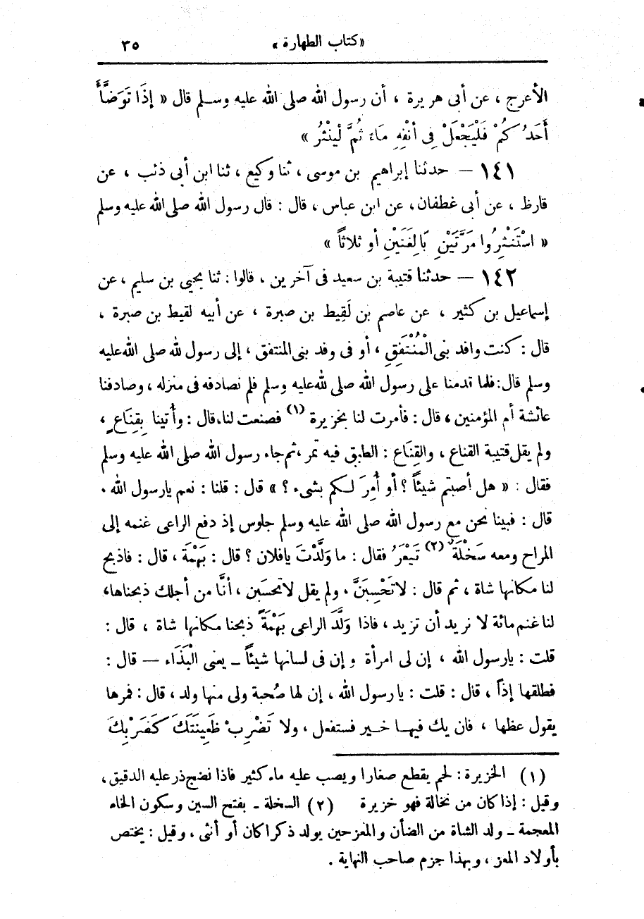 142 - حَدَّثَنَا قُتَيْبَةُ بْنُ سَعِيدٍ، فِي آخَرِينَ، قَالُوا: حَدَّثَنَا يَحْيَى بْنُ سُلَيْمٍ، عَنْ إِسْمَاعِيلَ بْنِ كَثِيرٍ، عَنْ عَاصِمِ بْنِ لَقِيطِ بْنِ صَبْرَةَ، عَنْ أَبِيهِ لَقِيطِ بْنِ صَبْرَةَ، قَالَ: كُنْتُ وَافِدَ بَنِي الْمُنْتَفِقِ - أَوْ فِي وَفْدِ بَنِي الْمُنْتَفِقِ - إِلَى رَسُولِ اللَّهِ صَلَّى اللهُ عَلَيْهِ وَسَلَّمَ، قَالَ: فَلَمَّا قَدِمْنَا عَلَى رَسُولِ اللَّهِ صَلَّى اللهُ عَلَيْهِ وَسَلَّمَ، فَلَمْ نُصَادِفْهُ فِي مَنْزِلِهِ، وَصَادَفْنَا عَائِشَةَ أُمَّ الْمُؤْمِنِينَ، قَالَ: فَأَمَرَتْ لَنَا بِخَزِيرَةٍ فَصُنِعَتْ لَنَا، قَالَ: وَأُتِينَا بِقِنَاعٍ - وَلَمْ يَقُلْ قُتَيْبَةُ: الْقِنَاعَ، وَالْقِنَاعُ: الطَّبَقُ فِيهِ تَمْرٌ - ثُمَّ جَاءَ رَسُولُ اللَّهِ صَلَّى اللهُ عَلَيْهِ وَسَلَّمَ فَقَالَ: «هَلْ أَصَبْتُمْ شَيْئًا؟ - أَوْ أُمِرَ لَكُمْ بِشَيْءٍ؟» قَالَ: قُلْنَا: نَعَمْ، يَا رَسُولَ اللَّهِ، قَالَ: فَبَيْنَا نَحْنُ مَعَ رَسُولِ اللَّهِ صَلَّى اللهُ عَلَيْهِ وَسَلَّمَ جُلُوسٌ، إِذْ دَفَعَ الرَّاعِي غَنَمَهُ إِلَى الْمُرَاحِ، وَمَعَهُ سَخْلَةٌ تَيْعَرُ، فَقَالَ: «مَا وَلَّدْتَ يَا فُلَانُ؟»، قَالَ: بَهْمَةً، قَالَ: «فَاذْبَحْ لَنَا مَكَانَهَا شَاةً»، ثُمَّ قَالَ: " لَا تَحْسِبَنَّ وَلَمْ يَقُلْ: لَا تَحْسَبَنَّ أَنَّا مِنْ أَجْلِكَ ذَبَحْنَاهَا، §لَنَا غَنَمٌ مِائَةٌ لَا نُرِيدُ أَنْ تَزِيدَ، فَإِذَا وَلَّدَ الرَّاعِي بَهْمَةً، ذَبَحْنَا مَكَانَهَا شَاةً " قَالَ: قُلْتُ: يَا رَسُولَ اللَّهِ، إِنَّ لِي امْرَأَةً وَإِنَّ فِي لِسَانِهَا شَيْئًا - يَعْنِي الْبَذَاءَ - قَالَ: «فَطَلِّقْهَا إِذًا»، قَالَ: قُلْتُ: يَا رَسُولَ اللَّهِ إِنَّ لَهَا صُحْبَةً، وَلِي مِنْهَا وَلَدٌ، قَالَ: " فَمُرْهَا يَقُولُ: عِظْهَا فَإِنْ يَكُ فِيهَا خَيْرٌ فَسَتَفْعَلْ، وَلَا تَضْرِبْ ظَعِينَتَكَ كَضَرْبِكَ -[36]- أُمَيَّتَكَ " فَقُلْتُ: يَا رَسُولَ اللَّهِ، أَخْبِرْنِي، عَنِ الْوُضُوءِ، قَالَ: «أَسْبِغِ الْوُضُوءَ، وَخَلِّلْ بَيْنَ الْأَصَابِعِ، وَبَالِغْ فِي الِاسْتِنْشَاقِ إِلَّا أَنْ تَكُونَ صَائِمًا».