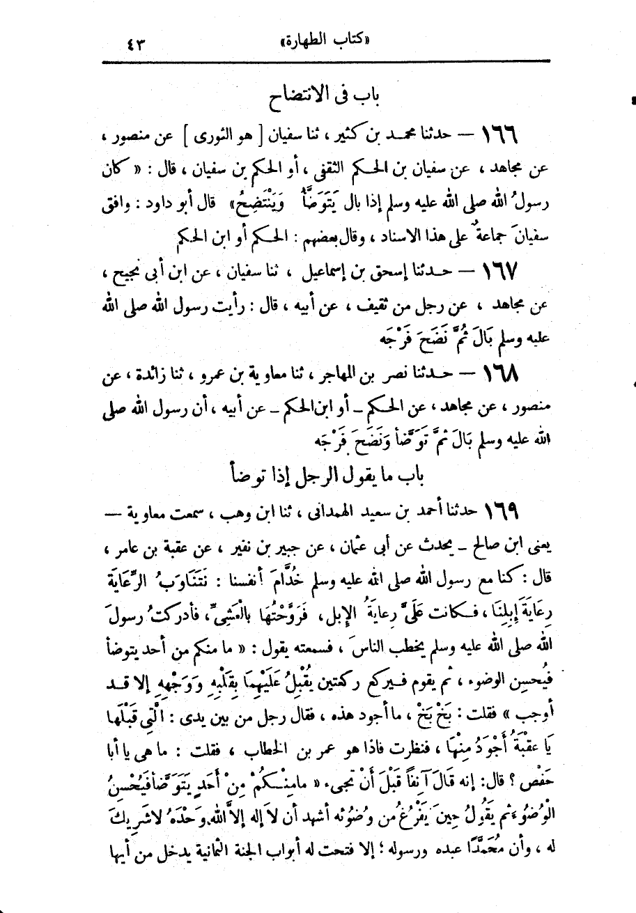 166 - حَدَّثَنَا مُحَمَّدُ بْنُ كَثِيرٍ، حَدَّثَنَا سُفْيَانُ هُوَ الثَّوْرِيُّ، عَنْ مَنْصُورٍ، عَنْ مُجَاهِدٍ، عَنْ سُفْيَانَ بْنِ الْحَكَمِ الثَّقَفِيِّ أَوِ الحَكَمِ بْنِ سُفْيَانَ الثَّقَفِيّ، قَالَ: كَانَ رَسُولُ اللَّهِ صَلَّى اللهُ عَلَيْهِ وَسَلَّمَ «§إِذَا بَالَ يَتَوَضَّأُ وَيَنْتَضِحُ»، قَالَ أَبُو دَاوُدَ: وَافَقَ سُفْيَانَ جَمَاعَةٌ عَلَى هَذَا الْإِسْنَادِ، وَقَالَ بَعْضُهُمْ: الْحَكَمُ أَوْ ابْنُ الْحَكَمِ