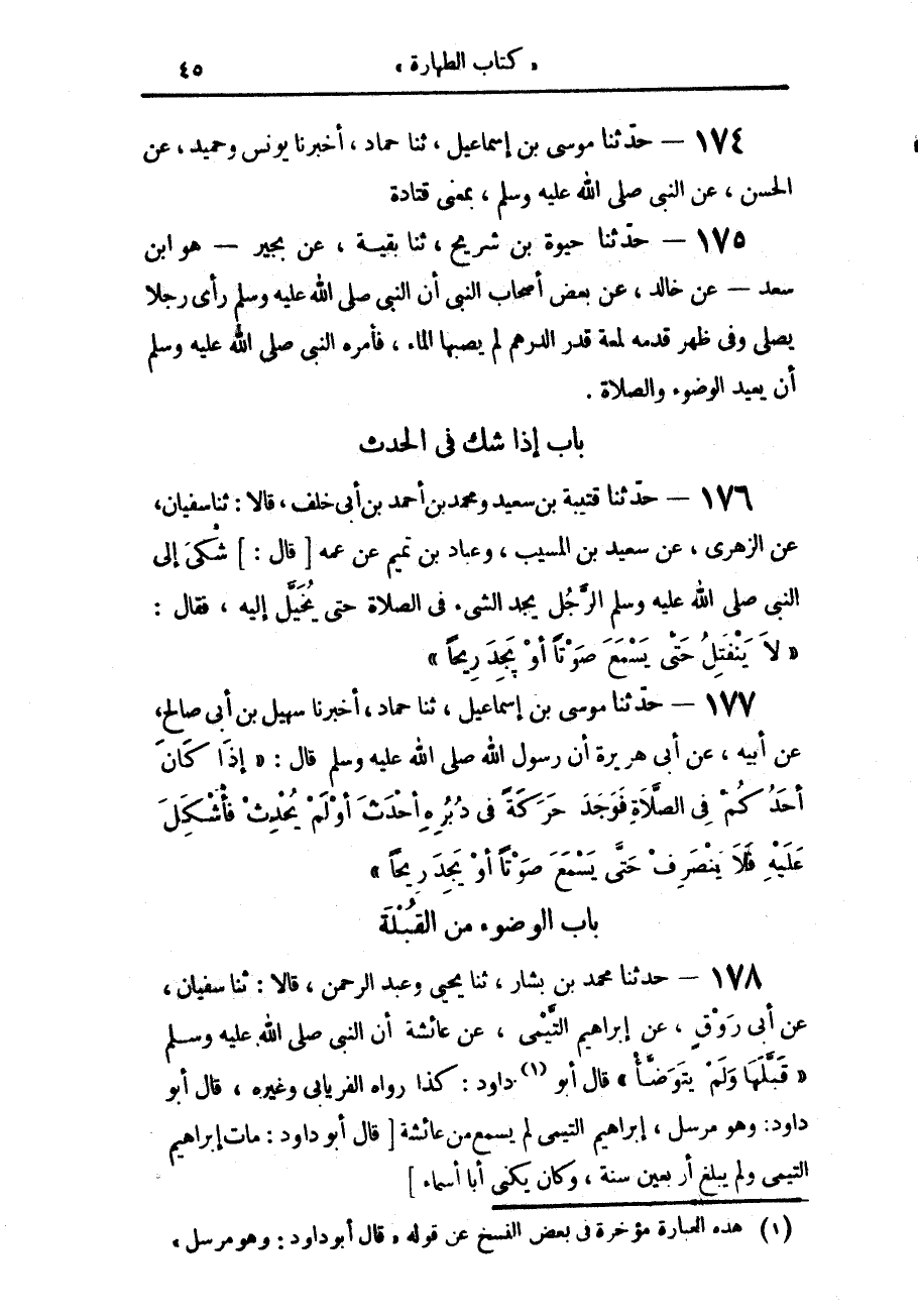 178 - حَدَّثَنَا مُحَمَّدُ بْنُ بَشَّارٍ، حَدَّثَنَا يَحْيَى، وَعَبْدُ الرَّحْمَنِ، قَالَا: حَدَّثَنَا سُفْيَانُ، عَنْ أَبِي رَوْقٍ، عَنْ إِبْرَاهِيمَ التَّيْمِيِّ، عَنْ عَائِشَةَ، «أَنَّ النَّبِيَّ صَلَّى اللهُ عَلَيْهِ وَسَلَّمَ §قَبَّلَهَا وَلَمْ يَتَوَضَّأْ»، قَالَ أَبُو دَاوُدَ: كَذَا رَوَاهُ الْفِرْيَابِيُّ، قَالَ أَبُو دَاوُدَ: وَهُوَ مُرْسَلٌ إِبْرَاهِيمُ التَّيْمِيُّ لَمْ يَسْمَعْ مِنْ عَائِشَةَ، قَالَ أَبُو دَاوُدَ: مَاتَ إِبْرَاهِيمُ التَّيْمِيُّ وَلَمْ يَبْلُغْ أَرْبَعِينَ سَنَةً، وَكَانَ يُكْنَى أَبَا أَسْمَاءَ