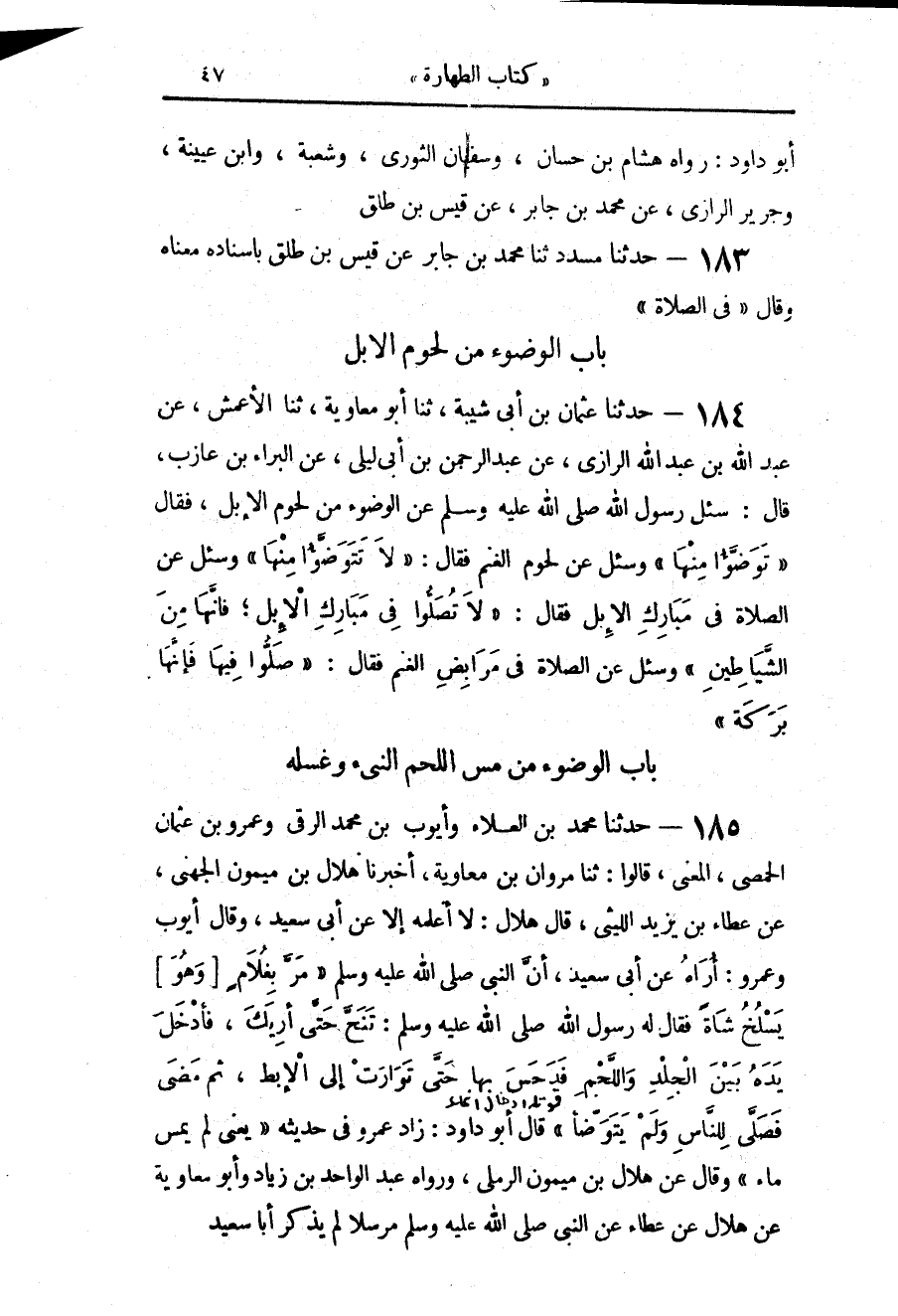 184 - حَدَّثَنَا عُثْمَانُ بْنُ أَبِي شَيْبَةَ، حَدَّثَنَا أَبُو مُعَاوِيَةَ، حَدَّثَنَا الْأَعْمَشُ، عَنْ عَبْدِ اللَّهِ بْنِ عَبْدِ اللَّهِ الرَّازِيِّ، عَنْ عَبْدِ الرَّحْمَنِ بْنِ أَبِي لَيْلَى، عَنِ الْبَرَاءِ بْنِ عَازِبٍ، قَالَ: " سُئِلَ رَسُولُ اللَّهِ صَلَّى اللهُ عَلَيْهِ وَسَلَّمَ عَنِ §الْوُضُوءِ مِنْ لُحُومِ الْإِبِلِ، فَقَالَ: «تَوَضَّئُوا مِنْهَا» وَسُئِلَ عَنْ لُحُومِ الْغَنَمِ، فَقَالَ: «لَا تَوَضَّئُوا مِنْهَا»، وَسُئِلَ عَنِ الصَّلَاةِ فِي مَبَارِكِ الْإِبِلِ، فَقَالَ: «لَا تُصَلُّوا فِي مَبَارِكِ الْإِبِلِ، فَإِنَّهَا مِنَ الشَّيَاطِينِ» وَسُئِلَ عَنِ الصَّلَاةِ فِي مَرَابِضِ الْغَنَمِ، فَقَالَ: «صَلُّوا فِيهَا فَإِنَّهَا بَرَكَةٌ»