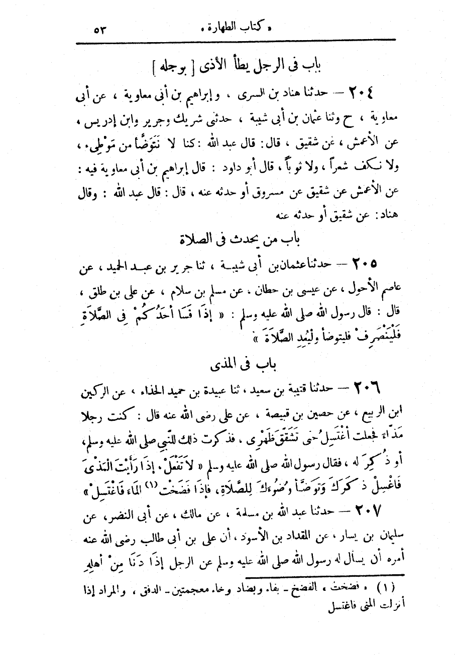 206 - حَدَّثَنَا قُتَيْبَةُ بْنُ سَعِيدٍ، حَدَّثَنَا عَبِيدَةُ بْنُ حُمَيْدٍ الْحَذَّاءُ، عَنِ الرَّكِينِ بْنِ الرَّبِيعِ، عَنْ حُصَيْنِ بْنِ قَبِيصَةَ، عَنْ عَلِيٍّ رَضِيَ اللَّهُ عَنْهُ، قَالَ: كُنْتُ رَجُلًا مَذَّاءً فَجَعَلْتُ أَغْتَسِلُ حَتَّى تَشَقَّقَ ظَهْرِي، فَذَكَرْتُ ذَلِكَ لِلنَّبِيِّ صَلَّى اللهُ عَلَيْهِ وَسَلَّمَ - أَوْ ذُكِرَ لَهُ - فَقَالَ رَسُولُ اللَّهِ صَلَّى اللهُ عَلَيْهِ وَسَلَّمَ: «لَا تَفْعَلْ §إِذَا رَأَيْتَ الْمَذْيَ فَاغْسِلْ ذَكَرَكَ، وَتَوَضَّأْ وُضُوءَكَ لِلصَّلَاةِ، فَإِذَا فَضَخْتَ الْمَاءَ فَاغْتَسِلْ»