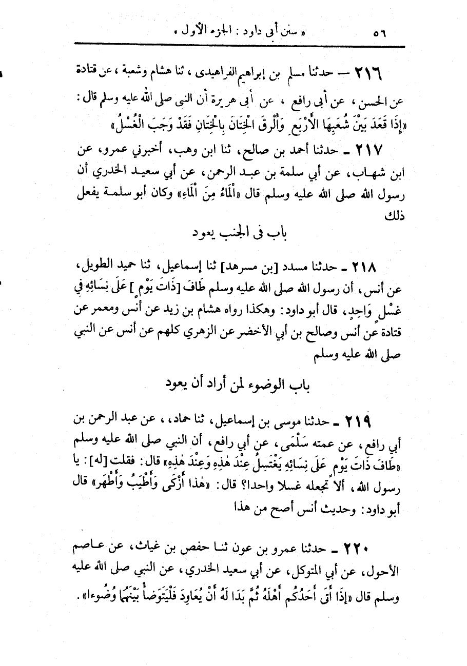 218 - حَدَّثَنَا مُسَدَّدُ بْنُ مُسَرْهَدٍ، حَدَّثَنَا إِسْمَاعِيلُ، حَدَّثَنَا حُمَيْدٌ الطَّوِيلُ، عَنْ أَنَسٍ، «أَنَّ رَسُولَ اللَّهِ صَلَّى اللهُ عَلَيْهِ وَسَلَّمَ §طَافَ ذَاتَ يَوْمٍ عَلَى نِسَائِهِ فِي غُسْلٍ وَاحِدٍ»، قَالَ أَبُو دَاوُدَ: وَهَكَذَا رَوَاهُ هِشَامُ بْنُ زَيْدٍ، عَنْ أَنَسٍ، وَمَعْمَرٌ، عَنْ قَتَادَةَ، عَنْ أَنَسٍ، وَصَالِحُ بْنُ أَبِي الْأَخْضَرِ، عَنِ الزُّهْرِيِّ، كُلُّهُمْ عَنْ أَنَسٍ، عَنِ النَّبِيِّ صَلَّى اللهُ عَلَيْهِ وَسَلَّمَ