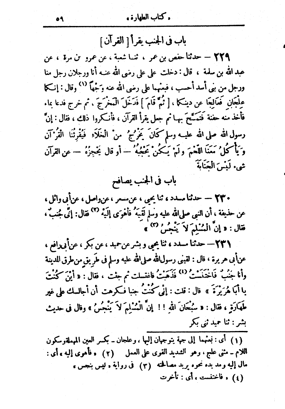 231 - حَدَّثَنَا مُسَدَّدٌ، حَدَّثَنَا يَحْيَى، وَبِشْرٌ، عَنْ حُمَيْدٍ، عَنْ بَكْرٍ، عَنْ أَبِي رَافِعٍ، عَنْ أَبِي هُرَيْرَةَ، قَالَ: لَقِيَنِي رَسُولُ اللَّهِ صَلَّى اللهُ عَلَيْهِ وَسَلَّمَ فِي طَرِيقٍ مِنْ طُرُقِ الْمَدِينَةِ وَأَنَا جُنُبٌ، فَاخْتَنَسْتُ فَذَهَبْتُ فَاغْتَسَلْتُ، ثُمَّ جِئْتُ فَقَالَ: «أَيْنَ كُنْتَ يَا أَبَا هُرَيْرَةَ؟» قَالَ: قُلْتُ: إِنِّي كُنْتُ جُنُبًا فَكَرِهْتُ أَنْ أُجَالِسَكَ عَلَى غَيْرِ طَهَارَةٍ. فَقَالَ: «سُبْحَانَ اللَّهِ، إِنَّ §الْمُسْلِمَ لَا يَنْجُسُ» وَقَالَ فِي حَدِيثِ بِشْرٍ، حَدَّثَنَا حُمَيْدٌ، حَدَّثَنِي بَكْرٌ