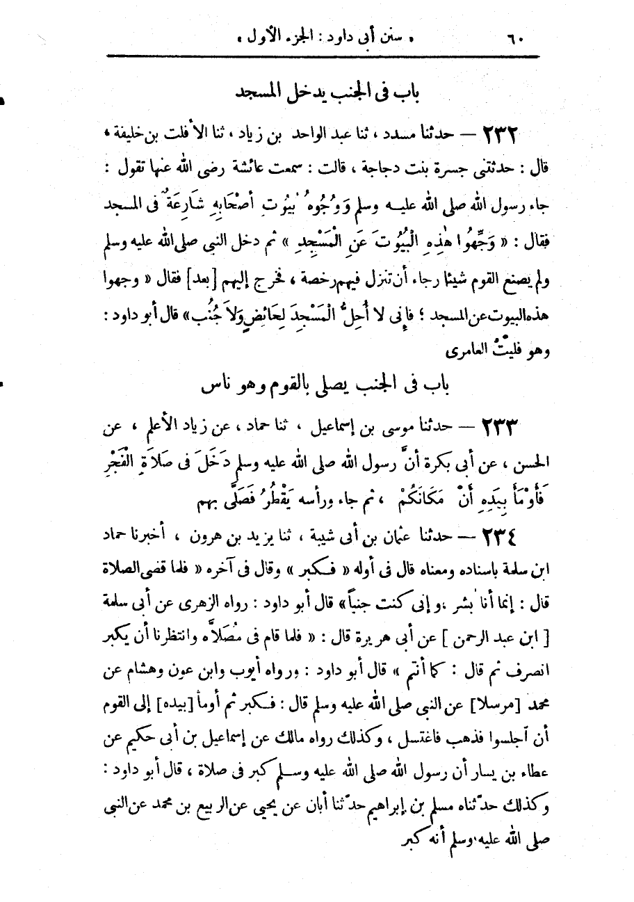 234 - حَدَّثَنَا عُثْمَانُ بْنُ أَبِي شَيْبَةَ، حَدَّثَنَا يَزِيدُ بْنُ هَارُونَ، أَخْبَرَنَا حَمَّادُ بْنُ سَلَمَةَ، بِإِسْنَادِهِ وَمَعْنَاهُ وَقَالَ: فِي أَوَّلِهِ: «فَكَبَّرَ». وَقَالَ فِي آخِرِهِ: " فَلَمَّا قَضَى الصَّلَاةَ قَالَ: «إِنَّمَا أَنَا بَشَرٌ، وَإِنِّي كُنْتُ جُنُبًا». قَالَ أَبُو دَاوُدَ: رَوَاهُ الزُّهْرِيُّ، عَنْ أَبِي سَلَمَةَ بْنِ عَبْدِ الرَّحْمَنِ، عَنْ أَبِي هُرَيْرَةَ قَالَ: " فَلَمَّا قَامَ فِي مُصَلَّاهُ، وَانْتَظَرْنَا أَنْ يُكَبِّرَ انْصَرَفَ، ثُمَّ قَالَ: «كَمَا أَنْتُمْ». قَالَ أَبُو دَاوُدَ: وَرَوَاهُ أَيُّوبُ، وَابْنُ عَوْنٍ، وَهِشَامٌ، عَنْ مُحَمَّدٍ مُرْسَلًا، عَنِ النَّبِيِّ صَلَّى اللهُ عَلَيْهِ وَسَلَّمَ، قَالَ: «فَكَبَّرَ ثُمَّ أَوْمَأَ بِيَدِهِ إِلَى الْقَوْمِ أَنِ اجْلِسُوا، فَذَهَبَ فَاغْتَسَلَ». وَكَذَلِكَ رَوَاهُ مَالِكٌ، عَنْ إِسْمَاعِيلَ بْنِ أَبِي حَكِيمٍ، عَنْ عَطَاءِ بْنِ يَسَارٍ، أَنَّ رَسُولَ اللَّهِ صَلَّى اللهُ عَلَيْهِ وَسَلَّمَ «كَبَّرَ فِي صَلَاةٍ». قَالَ أَبُو دَاوُدَ: وَكَذَلِكَ حَدَّثَنَاه مُسْلِمُ بْنُ إِبْرَاهِيمَ، حَدَّثَنَا أَبَانُ، عَنْ يَحْيَى، عَنِ الرَّبِيعِ بْنِ مُحَمَّدٍ، عَنِ النَّبِيِّ صَلَّى اللهُ عَلَيْهِ وَسَلَّمَ «أَنَّهُ كَبَّرَ»