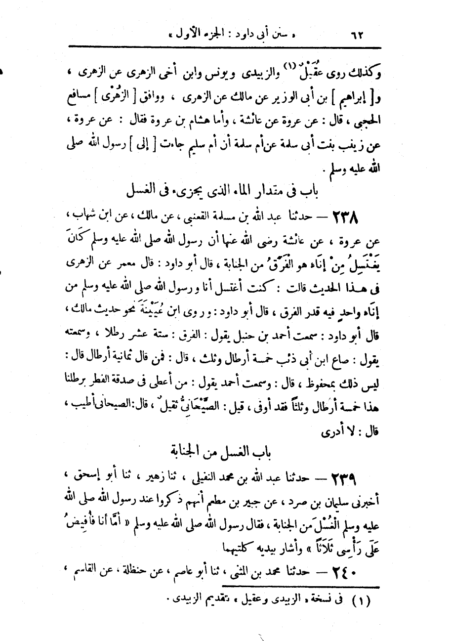 238 - حَدَّثَنَا عَبْدُ اللَّهِ بْنُ مَسْلَمَةَ الْقَعْنَبِيُّ، عَنْ مَالِكٍ، عَنِ ابْنِ شِهَابٍ، عَنْ عُرْوَةَ، عَنْ عَائِشَةَ رَضِيَ اللَّهُ عَنْهَا أَنَّ رَسُولَ اللَّهِ صَلَّى اللهُ عَلَيْهِ وَسَلَّمَ كَانَ «§يَغْتَسِلُ مِنْ إِنَاءٍ وَاحِدٍ - هُوَ الْفَرَقُ - مِنَ الجَنَابَةِ» قَالَ أَبُو دَاوُدَ: وَرَوَى ابْنُ عُيَيْنَةَ نَحْوَ حَدِيثِ مَالكٍ قَالَ أَبُو دَاوُدَ قَالَ: مَعْمَرٌ، عَنِ الزُّهْرِيِّ فِي هَذَا الْحَدِيثِ قَالَتْ: «كُنْتُ أَغْتَسِلُ أَنَا وَرَسُولُ اللَّهِ صَلَّى اللهُ عَلَيْهِ وَسَلَّمَ مِنْ إِنَاءٍ وَاحِدٍ فِيهِ قَدْرُ الْفَرَقِ» قَالَ أَبُو دَاوُدَ: سَمِعْت أَحْمَدَ بْنَ حَنْبَلٍ يَقُولُ: الْفَرَقُ: سِتَّةَ عَشَرَ رِطْلًا وَسَمِعْتُهُ يَقُولُ: صَاعُ ابْنِ أَبِي ذِئْبٍ خَمْسَةُ أَرْطَالٍ وَثُلُثٌ. قَالَ: فَمَنْ قَالَ: ثَمَانِيَةُ أَرْطَالٍ؟ قَالَ: لَيْسَ ذَلِكَ بِمَحْفُوظٍ قَالَ: وسَمِعْت أَحْمَد يَقُولُ: مَنْ أَعْطَى فِي صَدَقَةِ الْفِطْرِ بِرِطْلِنَا هَذَا خَمْسَةَ أَرْطَالٍ وَثُلُثًا فَقَدْ أَوْفَى قِيلَ الصَّيْحَانِيُّ ثَقِيلٌ. قَالَ: الصَّيْحَانِيُّ أَطْيَبُ قَالَ: لَا أَدْرِي