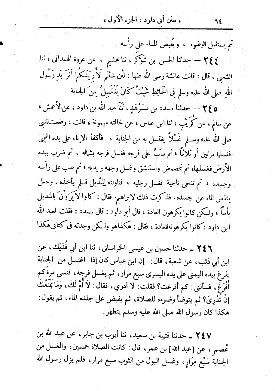245 - حَدَّثَنَا مُسَدَّدُ بْنُ مُسَرْهَدٍ، حَدَّثَنَا عَبْدُ اللَّهِ بْنُ دَاوُدَ، عَنِ الْأَعْمَشِ، عَنْ سَالِمٍ، عَنْ كُرَيْبٍ، حَدَّثَنَا ابْنُ عَبَّاسٍ، عَنْ خَالَتِهِ مَيْمُونَةَ قَالَتْ: «وَضَعْتُ للنبى صَلَّى اللهُ عَلَيْهِ وَسَلَّمَ غُسْلًا §يَغْتَسِلُ مِنَ الْجَنَابَةِ فَأَكْفَأَ الْإِنَاءَ عَلَى يَدِهِ الْيُمْنَى، فَغَسَلَهَا مَرَّتَيْنِ أَوْ ثَلَاثًا، ثُمَّ صَبَّ عَلَى فَرْجِهِ فَغَسَلَ فَرْجَهُ بِشِمَالِهِ، ثُمَّ ضَرَبَ بِيَدِهِ الْأَرْضَ فَغَسَلَهَا، ثُمَّ تَمَضْمَضَ وَاسْتَنْشَقَ، وَغَسَلَ وَجْهَهُ وَيَدَيْهِ، ثُمَّ صَبَّ عَلَى رَأْسِهِ وَجَسَدِهِ، ثُمَّ تَنَحَّى نَاحِيَةً فَغَسَلَ رِجْلَيْهِ، فَنَاوَلْتُهُ الْمِنْدِيلَ فَلَمْ يَأْخُذْهُ وَجَعَلَ يَنْفُضُ الْمَاءَ عَنْ جَسَدِهِ» فَذَكَرْتُ ذَلِكَ لِإِبْرَاهِيمَ فَقَالَ: «كَانُوا لَا يَرَوْنَ بِالْمِنْدِيلِ بَأْسًا، وَلَكِنْ كَانُوا يَكْرَهُونَ الْعَادَةَ» قَالَ أَبُو دَاوُدَ: قَالَ مُسَدَّدٌ: قُلْتُ لِعَبْدِ اللَّهِ بْنِ دَاوُدَ: كَانُوا يَكْرَهُونَهُ لِلْعَادَةِ؟ فَقَالَ: هَكَذَا هُوَ، وَلَكِنْ وَجَدْتُهُ فِي كِتَابِي هَكَذَا