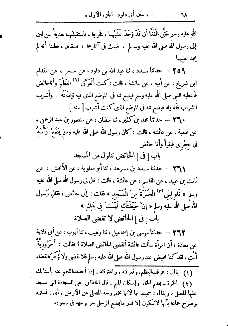 261 - حَدَّثَنَا مُسَدَّدُ بْنُ مُسَرْهَدٍ، حَدَّثَنَا أَبُو مُعَاوِيَةَ، عَنِ الْأَعْمَشِ، عَنْ ثَابِتِ بْنِ عُبَيْدٍ، عَنِ الْقَاسِمِ، عَنْ عَائِشَةَ، قَالَتْ: قَالَ لِي رَسُولُ اللَّهِ صَلَّى اللهُ عَلَيْهِ وَسَلَّمَ «§نَاوِلِينِي الْخُمْرَةَ مِنَ الْمَسْجِدِ». فَقُلْتُ: إِنِّي حَائِضٌ. فَقَالَ رَسُولُ اللَّهِ صَلَّى اللهُ عَلَيْهِ وَسَلَّمَ: «إِنَّ حَيْضَتَكِ لَيْسَتْ فِي يَدِكِ»