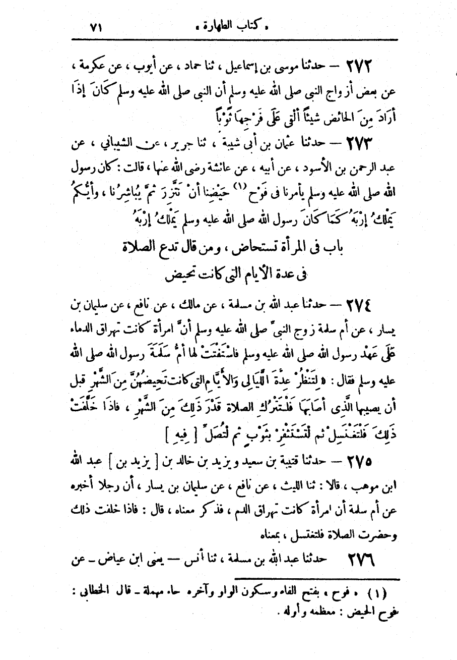 274 - حَدَّثَنَا عَبْدُ اللَّهِ بْنُ مَسْلَمَةَ، عَنْ مَالِكٍ، عَنْ نَافِعٍ، عَنْ سُلَيْمَانَ بْنِ يَسَارٍ، عَنْ أُمِّ سَلَمَةَ زَوْجِ النَّبِيِّ صَلَّى اللهُ عَلَيْهِ وَسَلَّمَ، أَنَّ امْرَأَةً كَانَتْ تُهَرَاقُ الدِّمَاءَ عَلَى عَهْدِ رَسُولِ اللَّهِ صَلَّى اللهُ عَلَيْهِ وَسَلَّمَ، فَاسْتَفْتَتْ لَهَا أُمُّ سَلَمَةَ رَسُولَ اللَّهِ صَلَّى اللهُ عَلَيْهِ وَسَلَّمَ فَقَالَ: «§لِتَنْظُرْ عِدَّةَ اللَّيَالِي وَالْأَيَّامِ الَّتِي كَانَتْ تَحِيضُهُنَّ مِنَ الشَّهْرِ قَبْلَ أَنْ يُصِيبَهَا الَّذِي أَصَابَهَا، فَلْتَتْرُكِ الصَّلَاةَ قَدْرَ ذَلِكَ مِنَ الشَّهْرِ، فَإِذَا خَلَّفَتْ ذَلِكَ فَلْتَغْتَسِلْ، ثُمَّ لِتَسْتَثْفِرْ بِثَوْبٍ، ثُمَّ لِتُصَلِّ فِيهِ»