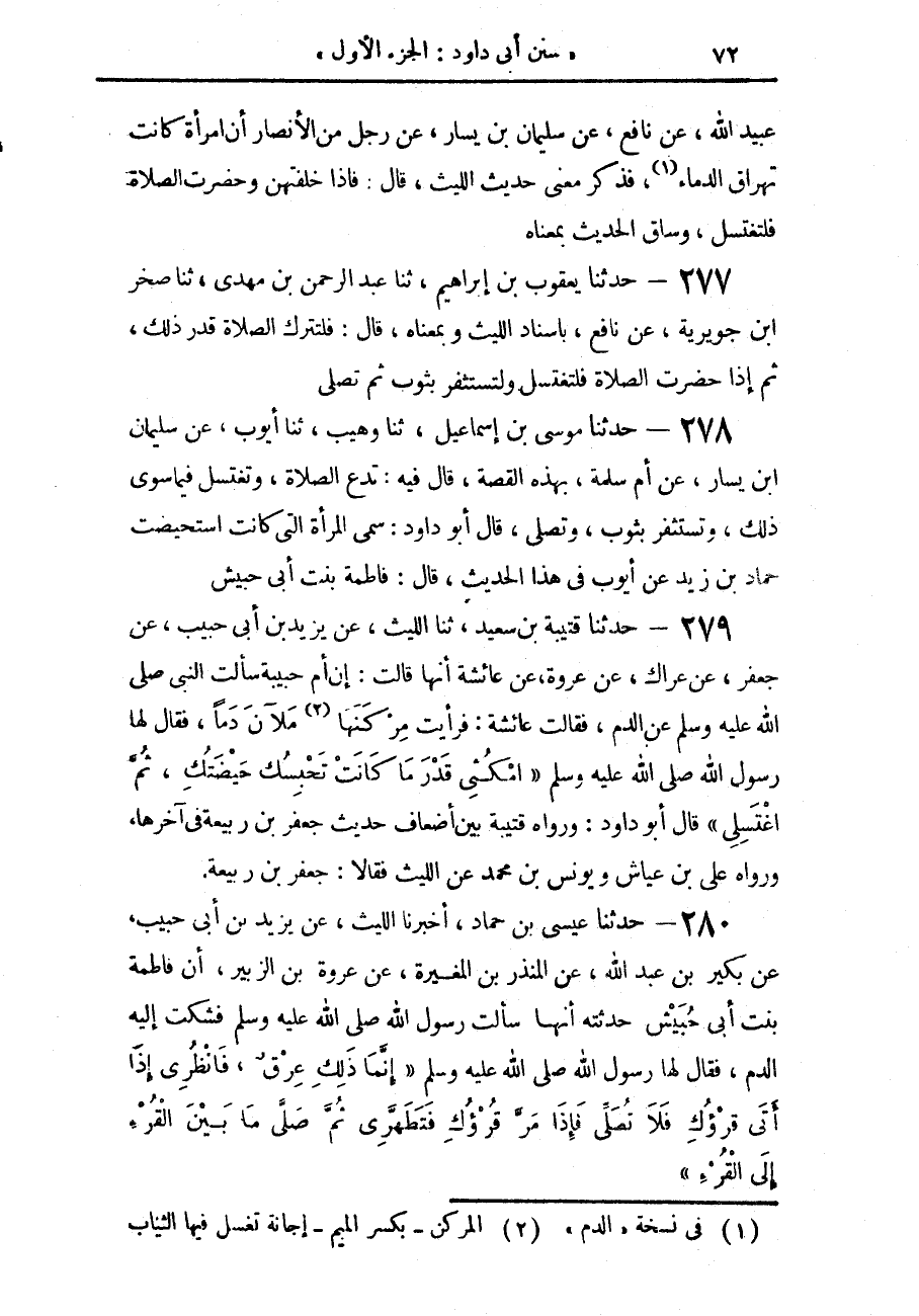 279 - حَدَّثَنَا قُتَيْبَةُ بْنُ سَعِيدٍ، حَدَّثَنَا اللَّيْثُ، عَنْ يَزِيدَ بْنِ أَبِي حَبِيبٍ، عَنْ جَعْفَرٍ، عَنْ عِرَاكٍ، عَنْ عُرْوَةَ، عَنْ عَائِشَةَ، أَنَّهَا قَالَتْ: إِنَّ أُمَّ حَبِيبَةَ سَأَلَتِ النَّبِيَّ صَلَّى اللهُ عَلَيْهِ وَسَلَّمَ عَنِ الدَّمِ، فَقَالَتْ عَائِشَةُ: فَرَأَيْتُ مِرْكَنَهَا مَلْآنَ دَمًا، فَقَالَ لَهَا رَسُولُ اللَّهِ صَلَّى اللهُ عَلَيْهِ وَسَلَّمَ «§امْكُثِي قَدْرَ مَا كَانَتْ تَحْبِسُكِ حَيْضَتُكِ، ثُمَّ اغْتَسِلِي» قَالَ أَبُو دَاوُدَ: وَرَوَاهُ قُتَيْبَةُ بَيْنَ أَضْعَافِ حَدِيثِ جَعْفَرِ بْنِ رَبِيعَة فِي آخِرِهَا، وَرَوَاهُ عَلِيُّ بْنُ عَيَّاشٍ، وَيُونُسُ بْنُ مُحَمَّدٍ، عَنِ اللَّيْثِ، فَقَالَا: جَعْفَرُ بْنُ رَبِيعَةَ