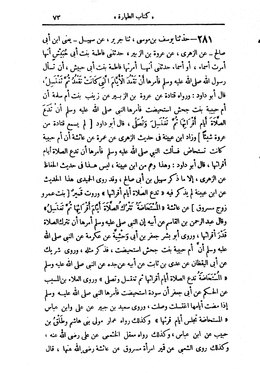 281 - حَدَّثَنَا يُوسُفُ بْنُ مُوسَى، حَدَّثَنَا جَرِيرٌ، عَنْ سُهَيْلٍ يَعْنِي ابْنَ أَبِي صَالِحٍ، عَنِ الزُّهْرِيِّ، عَنْ عُرْوَةَ بْنِ الزُّبَيْرِ، حَدَّثَتْنِي فَاطِمَةُ بِنْتُ أَبِي حُبَيْشٍ، أَنَّهَا أَمَرَتْ أَسْمَاءَ أَوْ أَسْمَاءُ حَدَّثَتْنِي أَنَّهَا أَمَرَتْهَا فَاطِمَةُ بِنْتُ أَبِي حُبَيْشٍ، أَنْ تَسْأَلَ رَسُولَ اللَّهِ صَلَّى اللهُ عَلَيْهِ وَسَلَّمَ «§فَأَمَرَهَا أَنْ تَقْعُدَ الْأَيَّامَ الَّتِي كَانَتْ تَقْعُدُ، ثُمَّ تَغْتَسِلُ» قَالَ أَبُو دَاوُدَ: وَرَوَاهُ قَتَادَةُ، عَنْ عُرْوَةَ بْنِ الزُّبَيْرِ، عَنْ زَيْنَبَ بِنْتِ أُمِّ سَلَمَةَ، أَنَّ أُمَّ حَبِيبَةَ بِنْتَ جَحْشٍ اسْتُحِيضَتْ، " فَأَمَرَهَا النَّبِيُّ صَلَّى اللهُ عَلَيْهِ وَسَلَّمَ: أَنْ تَدَعَ الصَّلَاةَ أَيَّامَ أَقْرَائِهَا، ثُمَّ تَغْتَسِلَ وَتُصَلِّيَ " قَالَ أَبُو دَاوُدَ: لَمْ يَسْمَعْ قَتَادَةُ مِنْ عُرْوَةَ شَيْئًا وَزَادَ ابْنُ عُيَيْنَةَ، فِي حَدِيثِ الزُّهْرِيِّ، عَنْ عَمْرَةَ، عَنْ عَائِشَةَ، أَنَّ أُمَّ حَبِيبَةَ كَانَتْ تُسْتَحَاضُ، فَسَأَلَتِ النَّبِيَّ صَلَّى اللهُ عَلَيْهِ وَسَلَّمَ «فَأَمَرَهَا أَنْ تَدَعَ الصَّلَاةَ أَيَّامَ أَقْرَائِهَا» قَالَ أَبُو دَاوُدَ: وَهَذَا وَهْمٌ مِنْ ابْنِ عُيَيْنَةَ لَيْسَ هَذَا فِي حَدِيثِ الْحِفَاظِ عَنِ الزُّهْرِيِّ، إِلَّا مَا ذَكَر سُهَيْلُ بْنُ أَبِي صَالِحٍ وَقَدْ رَوَى الْحُمَيْدِيُّ هَذَا الْحَدِيثَ عَنِ ابْنِ عُيَيْنَةَ لَمْ يَذْكُرْ فِيهِ: «تَدَعُ الصَّلَاةَ أَيَّامَ أَقْرَائِهَا» وَرَوَتْ قَمِيرُ بِنْتُ عَمْرٍو زَوْجُ مَسْرُوقٍ، عَنْ عَائِشَةَ «الْمُسْتَحَاضَةُ تَتْرُكُ الصَّلَاةَ أَيَّامَ أَقْرَائِهَا، ثُمَّ تَغْتَسِلُ» وَقَالَ عَبْدُ الرَّحْمَنِ بْنُ الْقَاسِمِ، عَنْ أَبِيهِ، إِنَّ النَّبِيَّ صَلَّى اللهُ عَلَيْهِ وَسَلَّمَ «أَمَرَهَا أَنْ تَتْرُكَ الصَّلَاةَ قَدْرَ أَقْرَائِهَا» وَرَوَى أَبُو بِشْرٍ جَعْفَرُ بْنُ أَبِي وَحْشِيَّةَ، عَنْ عِكْرِمَةَ، عَنِ النَّبِيِّ صَلَّى اللهُ عَلَيْهِ وَسَلَّمَ، أَنَّ أُمَّ حَبِيبَةَ بِنْتَ جَحْشٍ اسْتُحِيضَتْ، فَذَكَرَ مِثْلَهُ. وَرَوَى شَرِيكٌ، عَنْ أَبِي الْيَقْظَانِ، عَنْ عَدِيِّ بْنِ ثَابِتٍ، عَنْ أَبِيهِ، عَنْ جَدِّهِ، عَنِ النَّبِيِّ صَلَّى اللهُ عَلَيْهِ وَسَلَّمَ «الْمُسْتَحَاضَةُ تَدَعُ الصَّلَاةَ أَيَّامَ أَقْرَائِهَا، ثُمَّ تَغْتَسِلُ وَتُصَلِّي» وَرَوَى الْعَلَاءُ بْنُ الْمُسَيِّبِ، عَنِ الْحَكَمِ، عَنْ أَبِي جَعْفَرٍ، أَنَّ سَوْدَةَ اسْتُحِيضَتْ، «فَأَمَرَهَا النَّبِيُّ صَلَّى اللهُ عَلَيْهِ وَسَلَّمَ إِذَا مَضَتْ أَيَّامُهَا اغْتَسَلَتْ وَصَلَّتْ» وَرَوَى سَعِيدُ بْنُ جُبَيْرٍ، عَنْ عَلِيٍّ، وَابْنِ عَبَّاسٍ «الْمُسْتَحَاضَةُ تَجْلِسُ أَيَّامَ قُرْئِهَا» وَكَذَلِكَ رَوَاهُ عَمَّارٌ مَوْلَى بَنِي هَاشِمٍ، وَطَلْقُ بْنُ حَبِيبٍ، عَنِ ابْنِ عَبَّاسٍ، وَكَذَلِكَ رَوَاهُ مَعْقِلٌ الْخَثْعَمِيُّ، عَنْ عَلِيٍّ رَضِيَ اللَّهُ عَنْهُ وَكَذَلِكَ رَوَى الشَّعْبِيُّ، عَنْ قَمِيرَ امْرَأَة مَسْرُوقٍ، عَنْ عَائِشَةَ رَضِيَ اللَّهُ عَنْهَا. قَالَ -[74]- أَبُو دَاوُدَ: وَهُوَ قَوْل الْحَسَنِ، وَسَعِيدِ بْنِ الْمُسَيِّبِ، وَعَطَاءٍ، وَمَكْحُولٍ، وَإِبْرَاهِيمَ، وَسَالِمٍ، وَالْقَاسِمِ، «أَنَّ الْمُسْتَحَاضَةَ تَدَعُ الصَّلَاةَ أَيَّامَ أَقْرَائِهَا» قَالَ أَبُو دَاوُدَ: «لَمْ يَسْمَع قَتَادَة مِن عُرْوَة شَيْئًا»