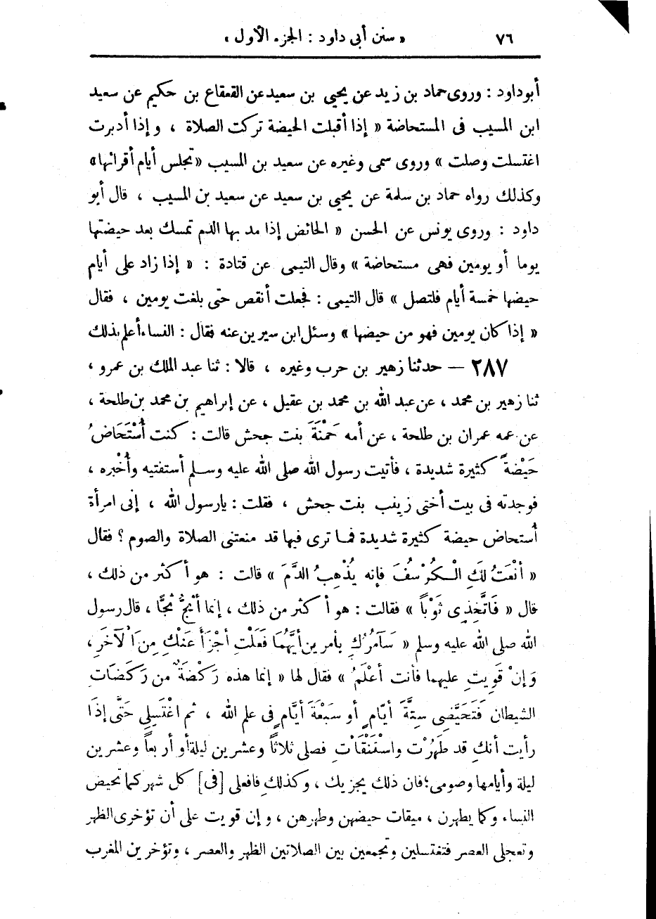 287 - حَدَّثَنَا زُهَيْرُ بْنُ حَرْبٍ، وَغَيْرُهُ قَالَا: حَدَّثَنَا عَبْدُ الْمَلِكِ بْنُ عَمْرٍو، حَدَّثَنَا زُهَيْرُ بْنُ مُحَمَّدٍ، عَنْ عَبْدِ اللَّهِ بْنِ مُحَمَّدِ بْنِ عَقِيلٍ، عَنْ إِبْرَاهِيمَ بْنِ مُحَمَّدِ بْنِ طَلْحَةَ، عَنْ عَمِّهِ عِمْرَانَ بْنِ طَلْحَةَ، عَنْ أُمِّهِ حَمْنَةَ بِنْتِ جَحْشٍ قَالَتْ: كُنْتُ أُسْتَحَاضُ حَيْضَةً كَثِيرَةً شَدِيدَةً، فَأَتَيْتُ رَسُولَ اللَّهِ صَلَّى اللهُ عَلَيْهِ وَسَلَّمَ أَسْتَفْتِيهِ وَأُخْبِرُهُ، فَوَجَدْتُهُ فِي بَيْتِ أُخْتِي زَيْنَبَ بِنْتِ جَحْشٍ فَقُلْتُ: يَا رَسُولَ اللَّهِ، إِنِّي امْرَأَةٌ أُسْتَحَاضُ حَيْضَةً كَثِيرَةً شَدِيدَةً، فَمَا تَرَى فِيهَا قَدْ مَنَعَتْنِي الصَّلَاةَ وَالصَّوْمَ. فَقَالَ: «أَنْعَتُ لَكِ الْكُرْسُفَ، فَإِنَّهُ يُذْهِبُ الدَّمَ». قَالَتْ: هُوَ أَكْثَرُ مِنْ ذَلِكَ. قَالَ: «فَاتَّخِذِي ثَوْبًا». فَقَالَتْ: هُوَ أَكْثَرُ مِنْ ذَلِكَ إِنَّمَا أَثُجُّ ثَجًّا. قَالَ رَسُولُ اللَّهِ صَلَّى اللهُ عَلَيْهِ وَسَلَّمَ: «سَآمُرُكِ بِأَمْرَيْنِ أَيَّهُمَا فَعَلْتِ أَجْزَأَ عَنْكِ مِنَ الْآخَرِ، وَإِنْ قَوِيتِ عَلَيْهِمَا فَأَنْتِ أَعْلَمُ». قَالَ لَهَا: «إِنَّمَا §هَذِهِ رَكْضَةٌ مِنْ رَكَضَاتِ الشَّيْطَانِ فَتَحَيَّضِي سِتَّةَ أَيَّامٍ أَوْ سَبْعَةَ أَيَّامٍ فِي عِلْمِ اللَّهِ، ثُمَّ اغْتَسِلِي حَتَّى إِذَا رَأَيْتِ أَنَّكِ قَدْ طَهُرْتِ، وَاسْتَنْقَأْتِ فَصَلِّي ثَلَاثًا وَعِشْرِينَ لَيْلَةً أَوْ أَرْبَعًا وَعِشْرِينَ لَيْلَةً وَأَيَّامَهَا وَصُومِي، فَإِنَّ ذَلِكَ يَجْزِيكِ، وَكَذَلِكَ فَافْعَلِي فِي كُلِّ شَهْرٍ كَمَا تَحِيضُ النِّسَاءُ، وَكَمَا يَطْهُرْنَ مِيقَاتُ حَيْضِهِنَّ وَطُهْرِهِنَّ، وَإِنْ قَوِيتِ عَلَى أَنْ تُؤَخِّرِي الظُّهْرَ وَتُعَجِّلِي الْعَصْرَ فَتَغْتَسِلِينَ وَتَجْمَعِينَ بَيْنَ الصَّلَاتَيْنِ الظُّهْرِ وَالْعَصْرِ، وَتُؤَخِّرِينَ الْمَغْرِبَ -[77]- وَتُعَجِّلِينَ الْعِشَاءَ، ثُمَّ تَغْتَسِلِينَ وَتَجْمَعِينَ بَيْنَ الصَّلَاتَيْنِ فَافْعَلِي، وَتَغْتَسِلِينَ مَعَ الْفَجْرِ فَافْعَلِي، وَصُومِي إِنْ قَدِرْتِ عَلَى ذَلِكَ». قَالَ رَسُولُ اللَّهِ صَلَّى اللهُ عَلَيْهِ وَسَلَّمَ: «وَهَذَا أَعْجَبُ الْأَمْرَيْنِ إِلَيَّ» قَالَ أَبُو دَاوُدَ: وَرَوَاهُ عَمْرُو بْنُ ثَابِتٍ، عَنِ ابْنِ عَقِيلٍ قَالَ: فَقَالَتْ: حَمْنَةُ فَقُلْتُ: «هَذَا أَعْجَبُ الْأَمْرَيْنِ إِلَيَّ» لَمْ يَجْعَلْهُ مِنْ قَوْلِ النَّبِيِّ صَلَّى اللهُ عَلَيْهِ وَسَلَّمَ جَعَلَهُ كَلَامَ حَمْنَةَ قَالَ أَبُو دَاوُدَ: وَعَمْرُو بْنُ ثَابِتٍ رَافِضِيٌّ رَجُلُ سُوءٍ وَلَكِنَّهُ كَانَ صَدُوقًا فِي الْحَدِيثِ وَثَابِتُ بْنُ الْمِقْدَامِ رَجُلٌ ثِقَةٌ وَذَكَرَهُ، عَنْ يَحْيَى بْنِ مَعِينٍ قَالَ أَبُو دَاوُدَ: سَمِعْت أَحْمَدَ يَقُولُ: حَدِيثُ ابْنِ عَقِيلٍ فِي نَفْسِي مِنْهُ شَيْءٌ