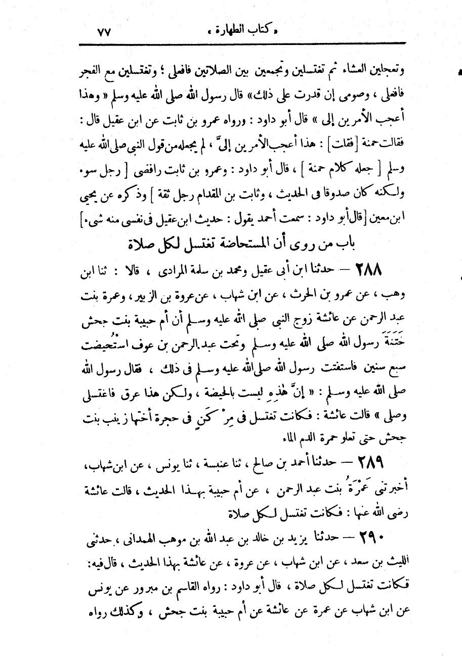 289 - حَدَّثَنَا أَحْمَدُ بْنُ صَالِحٍ، حَدَّثَنَا عَنْبَسَةُ، حَدَّثَنَا يُونُسُ، عَنِ ابْنِ شِهَابٍ، أَخْبَرَتْنِي عَمْرَةُ بِنْتُ عَبْدِ الرَّحْمَنِ، عَنْ أُمِّ حَبِيبَةَ بِهَذَا الْحَدِيثِ قَالَتْ عَائِشَةُ رَضِيَ اللَّهُ عَنْهَا: «فَكَانَتْ تَغْتَسِلُ لِكُلِّ صَلَاةٍ».