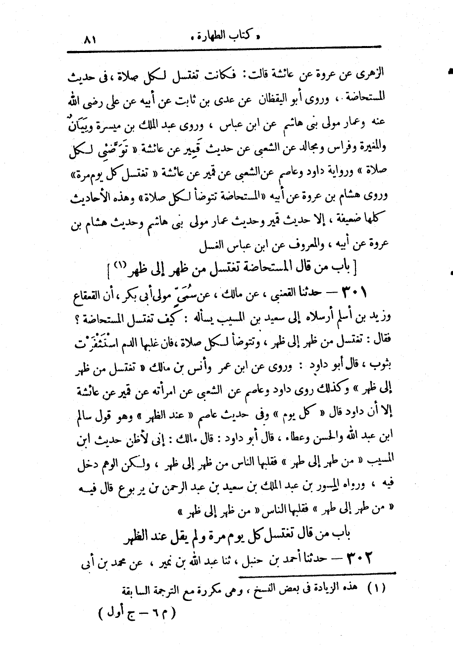 301 - حَدَّثَنَا الْقَعْنَبِيُّ، عَنْ مَالِكٍ، عَنْ سُمَيٍّ مَوْلَى أَبِي بَكْرٍ، أَنَّ الْقَعْقَاعَ، وَزَيْدَ بْنَ أَسْلَمَ أَرْسَلَاهُ إِلَى سَعِيدِ بْنِ الْمُسَيِّبِ يَسْأَلُهُ كَيْفَ §تَغْتَسِلُ الْمُسْتَحَاضَةُ فَقَالَ: «تَغْتَسِلُ مِنْ ظُهْرٍ إِلَى ظُهْرٍ، وَتَتَوَضَّأُ لِكُلِّ صَلَاةٍ، فَإِنْ غَلَبَهَا الدَّمُ اسْتَثْفَرَتْ بِثَوْبٍ» قَالَ أَبُو دَاوُدَ: وَرُوِيَ عَنِ ابْنِ عُمَرَ، وَأَنَسِ بْنِ مَالِكٍ «تَغْتَسِلُ مِنْ ظُهْرٍ إِلَى ظُهْرٍ» وَكَذَلِكَ رَوَى دَاوُدُ، وَعَاصِمٌ، عَنِ الشَّعْبِيِّ، عَنِ امْرَأَتِهِ، عَنْ قَمِيرَ، عَنْ عَائِشَةَ، " إِلَّا أَنَّ دَاوُدَ قَالَ: «كُلَّ يَوْمٍ»، وَفِي حَدِيثِ عَاصِمٍ «عِنْدَ الظُّهْرِ»، وَهُوَ قَوْلُ سَالِمِ بْنِ عَبْدِ اللَّهِ، وَالْحَسَنِ، وَعَطَاءٍ " قَالَ أَبُو دَاوُدَ: " قَالَ مَالِكٌ: إِنِّي لَأَظُنُّ حَدِيثَ ابْنِ الْمُسَيَّب «مِنْ ظُهْرٍ إِلَى ظُهْرٍ»، إِنَّمَا هُوَ «مِنْ طُهْرٍ إِلَى طُهْرٍ»، وَلَكِنَّ الْوَهْمَ دَخَلَ فِيهِ فَقَلَبَهَا النَّاسُ فَقَالُوا: مِنْ ظُهْرٍ إِلَى ظُهْرٍ " وَرَوَاهُ مِسْوَرُ بْنُ عَبْدِ الْمَلِكِ بْنِ سَعِيدِ بْنِ عَبْدِ الرَّحْمَنِ بْنِ يَرْبُوعٍ، قَالَ فِيهِ: «مِنْ طُهْرٍ إِلَى طُهْرٍ» فَقَلَبَهَا النَّاسُ: مِنْ ظُهْرٍ إِلَى ظُهْرٍ "