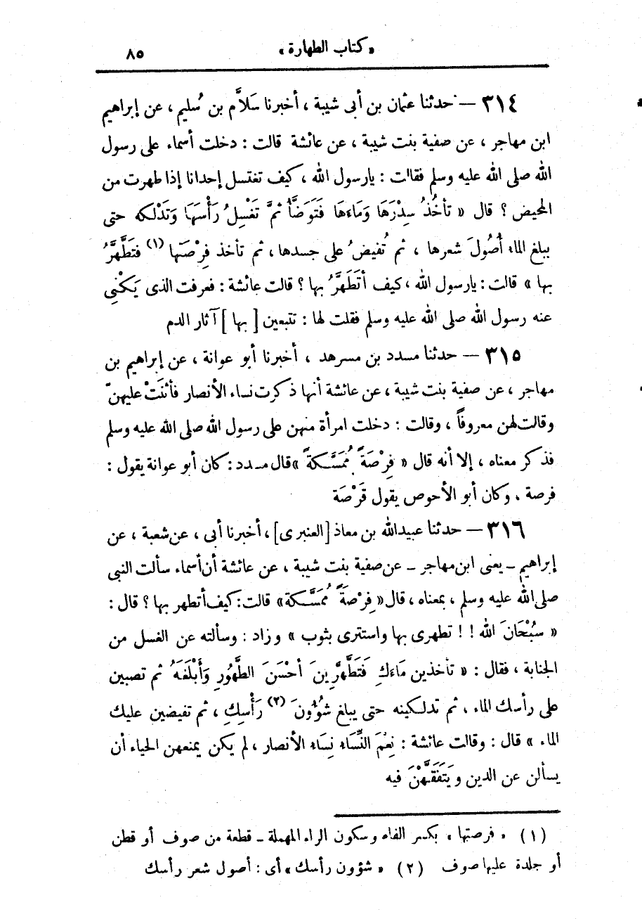 315 - حَدَّثَنَا مُسَدَّدُ بْنُ مُسَرْهَدٍ، أَخْبَرَنَا أَبُو عَوَانَةَ، عَنْ إِبْرَاهِيمَ بْنِ مُهَاجِرٍ، عَنْ صَفِيَّةَ بِنْتِ شَيْبَةَ، عَنْ عَائِشَةَ أَنَّهَا ذَكَرَتْ نِسَاءَ الْأَنْصَارِ، فَأَثْنَتْ عَلَيْهِنَّ وَقَالَتْ لَهُنَّ: مَعْرُوفًا، وَقَالَتْ: دَخَلَتِ امْرَأَةٌ مِنْهُنَّ عَلَى رَسُولِ اللَّهِ صَلَّى اللهُ عَلَيْهِ وَسَلَّمَ، فَذَكَرَ مَعْنَاهُ إِلَّا أَنَّهُ قَالَ «فِرْصَةً مُمَسَّكَةً». قَالَ مُسَدَّدٌ: كَانَ أَبُو عَوَانَةَ يَقُولُ: «فِرْصَةً»، وَكَانَ أَبُو الْأَحْوَصِ يَقُولُ: «قَرْصَةً».