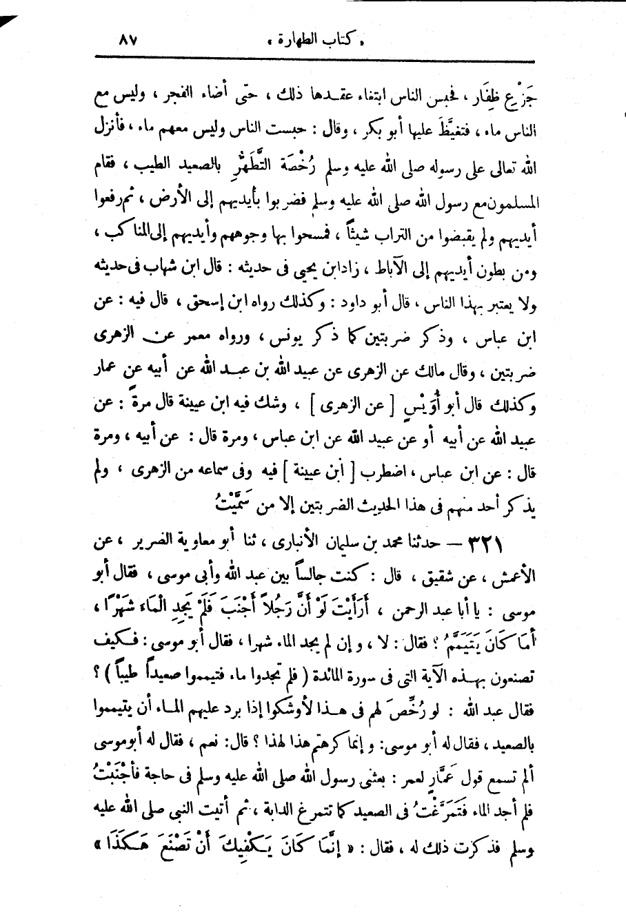 321 - حَدَّثَنَا مُحَمَّدُ بْنُ سُلَيْمَانَ الْأَنْبَارِيُّ، حَدَّثَنَا أَبُو مُعَاوِيَةَ الضَّرِيرُ، عَنِ الْأَعْمَشِ، عَنْ شَقِيقٍ قَالَ: كُنْتُ جَالِسًا بَيْنَ عَبْدِ اللَّهِ، وَأَبِي مُوسَى، فقَالَ أَبُو مُوسَى: يَا أَبَا عَبْدِ الرَّحْمَنِ أَرَأَيْتَ لَوْ أَنَّ رَجُلًا أَجْنَبَ فَلَمْ يَجِدِ الْمَاءَ شَهْرًا أَمَا كَانَ يَتَيَمَّمُ؟ فَقَالَ: لَا، وَإِنْ لَمْ يَجِدِ الْمَاءَ شَهْرًا. فَقَالَ أَبُو مُوسَى: فَكَيْفَ تَصْنَعُونَ بِهَذِهِ الْآيَةِ الَّتِي فِي سُورَةِ الْمَائِدَةِ {فَلَمْ تَجِدُوا مَاءً فَتَيَمَّمُوا صَعِيدًا طَيِّبًا} [النساء: 43] فَقَالَ عَبْدُ اللَّهِ: لَوْ رُخِّصَ لَهُمْ فِي هَذَا لَأَوْشَكُوا إِذَا بَرَدَ عَلَيْهِمُ الْمَاءُ أَنْ يَتَيَمَّمُوا بِالصَّعِيدِ. فَقَالَ لَهُ أَبُو مُوسَى: وَإِنَّمَا كَرِهْتُمْ هَذَا لِهَذَا. قَالَ: نَعَمْ. فَقَالَ لَهُ أَبُو مُوسَى: أَلَمْ تَسْمَعْ قَوْلَ عَمَّارٍ لِعُمَر بَعَثَنِي رَسُولُ اللَّهِ صَلَّى اللهُ عَلَيْهِ وَسَلَّمَ فِي حَاجَةٍ فَأَجْنَبْتُ، فَلَمْ أَجِدَ الْمَاءَ فَتَمَرَّغْتُ فِي الصَّعِيدِ كَمَا تَتَمَرَّغُ الدَّابَّةُ، ثُمَّ أَتَيْتُ النَّبِيَّ صَلَّى اللهُ عَلَيْهِ وَسَلَّمَ، فَذَكَرْتُ ذَلِكَ لَهُ فَقَالَ: «§إِنَّمَا كَانَ يَكْفِيكَ أَنْ تَصْنَعَ هَكَذَا -[88]- فَضَرَبَ بِيَدِهِ عَلَى الْأَرْضِ فَنَفَضَهَا، ثُمَّ ضَرَبَ بِشِمَالِهِ عَلَى يَمِينِهِ وَبِيَمِينِهِ عَلَى شِمَالِهِ عَلَى الْكَفَّيْنِ، ثُمَّ مَسَحَ وَجْهَهُ» فَقَالَ لَهُ عَبْدُ اللَّهِ: أَفَلَمْ تَرَ عُمَرَ لَمْ يَقْنَعْ بِقَوْلِ عَمَّارٍ
