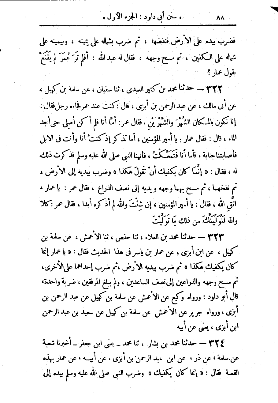 323 - حَدَّثَنَا مُحَمَّدُ بْنُ الْعَلَاءِ، حَدَّثَنَا حَفْصٌ، حَدَّثَنَا الْأَعْمَشُ، عَنْ سَلَمَةَ بْنِ كُهَيْلٍ، عَنِ ابْنِ أَبْزَى، عَنْ عَمَّارِ بْنِ يَاسِرٍ فِي هَذَا الْحَدِيثِ فَقَالَ: «يَا عَمَّارُ إِنَّمَا كَانَ يَكْفِيكَ هَكَذَا، ثُمَّ ضَرَبَ بِيَدَيْهِ الْأَرْضَ، ثُمَّ ضَرَبَ إِحْدَاهُمَا عَلَى الْأُخْرَى، ثُمَّ مَسَحَ وَجْهَهُ وَالذِّرَاعَيْنِ إِلَى نِصْفِ السَّاعِدَيْنِ، وَلَمْ يَبْلُغِ الْمِرْفَقَيْنِ ضَرْبَةً وَاحِدَةً» قَالَ أَبُو دَاوُدَ: وَرَوَاهُ وَكِيعٌ، عَنِ الْأَعْمَشِ، عَنْ سَلَمَةَ بْنِ كُهَيْلٍ، عَنْ عَبْدِ الرَّحْمَنِ بْنِ أَبْزَى، وَرَوَاهُ جَرِيرٌ، عَنِ الْأَعْمَشِ، عَنْ سَلَمَةَ بْنِ كُهَيْلٍ، عَنْ سَعِيدِ بْنِ عَبْدِ الرَّحْمَنِ بْنِ أَبْزَى يَعْنِي، عَنْ أَبِيهِ،