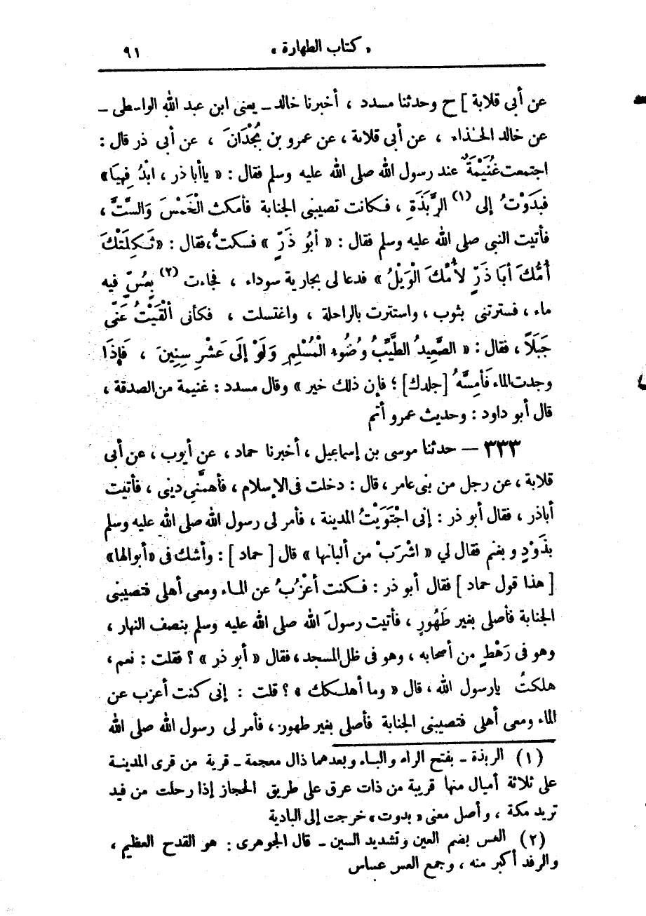 333 - حَدَّثَنَا مُوسَى بْنُ إِسْمَاعِيلَ، أَخْبَرَنَا حَمَّادٌ، عَنْ أَيُّوبَ، عَنْ أَبِي قِلَابَةَ، عَنْ رَجُلٍ مِنْ بَنِي عَامِرٍ قَالَ: دَخَلْتُ فِي الْإِسْلَامِ فَأَهَمَّنِي دِينِي، فَأَتَيْتُ أَبَا ذَرٍّ فَقَالَ: أَبُو ذَرٍّ إِنِّي اجْتَوَيْتُ الْمَدِينَةَ، فَأَمَرَ لِي رَسُولُ اللَّهِ صَلَّى اللهُ عَلَيْهِ وَسَلَّمَ بِذَوْدٍ وَبِغَنَمٍ فَقَالَ لِي: «اشْرَبْ مِنْ أَلْبَانِهَا» - قَالَ حَمَّادٌ: وَأَشُكُّ فِي أَبْوَالِهَا، هَذَا قَوْلُ حَمَّادٍ - فَقَالَ أَبُو ذَرٍّ: فَكُنْتُ أَعْزُبُ عَنِ الْمَاءِ، وَمَعِي أَهْلِي فَتُصِيبُنِي الْجَنَابَةُ فَأُصَلِّي بِغَيْرِ طَهُورٍ، فَأَتَيْتُ رَسُولَ اللَّهِ صَلَّى اللهُ عَلَيْهِ وَسَلَّمَ بِنِصْفِ النَّهَارِ، وَهُوَ فِي رَهْطٍ مِنْ أَصْحَابِهِ، وَهُوَ فِي ظِلِّ الْمَسْجِدِ، فَقَالَ أَبُو ذَرٍّ: فَقُلْتُ: نَعَمْ. هَلَكْتُ يَا رَسُولَ اللَّهِ، قَالَ: «وَمَا أَهْلَكَكَ؟» قُلْتُ: إِنِّي كُنْتُ أَعْزُبُ عَنِ الْمَاءِ، وَمَعِي أَهْلِي فَتُصِيبُنِي الْجَنَابَةُ فَأُصَلِّي بِغَيْرِ طُهُورٍ، فَأَمَرَ لِي رَسُولُ اللَّهِ صلّى الله -[92]- عليه وسلم بِمَاءٍ، فَجَاءَتْ بِهِ جَارِيَةٌ سَوْدَاءُ بِعُسٍّ يَتَخَضْخَضُ مَا هُوَ بِمَلْآنَ، فَتَسَتَّرْتُ إِلَى بَعِيرِي، فَاغْتَسَلْتُ، ثُمَّ جِئْتُ، فَقَالَ رَسُولُ اللَّهِ صَلَّى اللهُ عَلَيْهِ وَسَلَّمَ: " يَا أَبَا ذَرٍّ: إِنَّ §الصَّعِيدَ الطَّيِّبَ طَهُورٌ، وَإِنْ لَمْ تَجِدِ الْمَاءَ إِلَى عَشْرِ سِنِينَ، فَإِذَا وَجَدْتَ الْمَاءَ، فَأَمِسَّهُ جِلْدَكَ " قَالَ أَبُو دَاوُدَ: «رَوَاهُ حَمَّادُ بْنُ زَيْدٍ، عَنْ أَيُّوبَ لَمْ يَذْكُرْ أَبْوَالَهَا» قَالَ أَبُو دَاوُدَ: «هَذَا لَيْسَ بِصَحِيحٍ، وَلَيْسَ فِي أَبْوَالِهَا إِلَّا حَدِيثُ أَنَسٍ تَفَرَّدَ بِهِ أَهْلُ الْبَصْرَةِ»