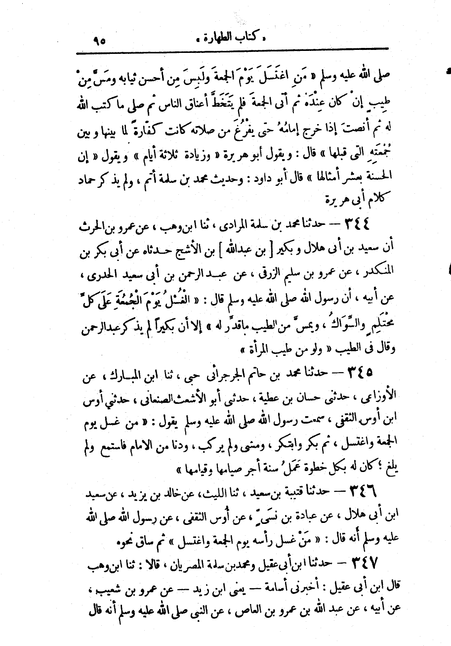 346 - حَدَّثَنَا قُتَيْبَةُ بْنُ سَعِيدٍ، حَدَّثَنَا اللَّيْثُ، عَنْ خَالِدِ بْنِ يَزِيدَ، عَنْ سَعِيدِ بْنِ أَبِي هِلَالٍ، عَنْ عُبَادَةَ بْنِ نُسَيٍّ، عَنْ أَوْسٍ الثَّقَفِيِّ، عَنْ رَسُولِ اللَّهِ صَلَّى اللهُ عَلَيْهِ وَسَلَّمَ أَنَّهُ قَالَ: «مَنْ غَسَلَ رَأْسَهُ يَوْمَ الْجُمُعَةِ وَاغْتَسَلَ» ثُمَّ سَاقَ نَحْوَهُ