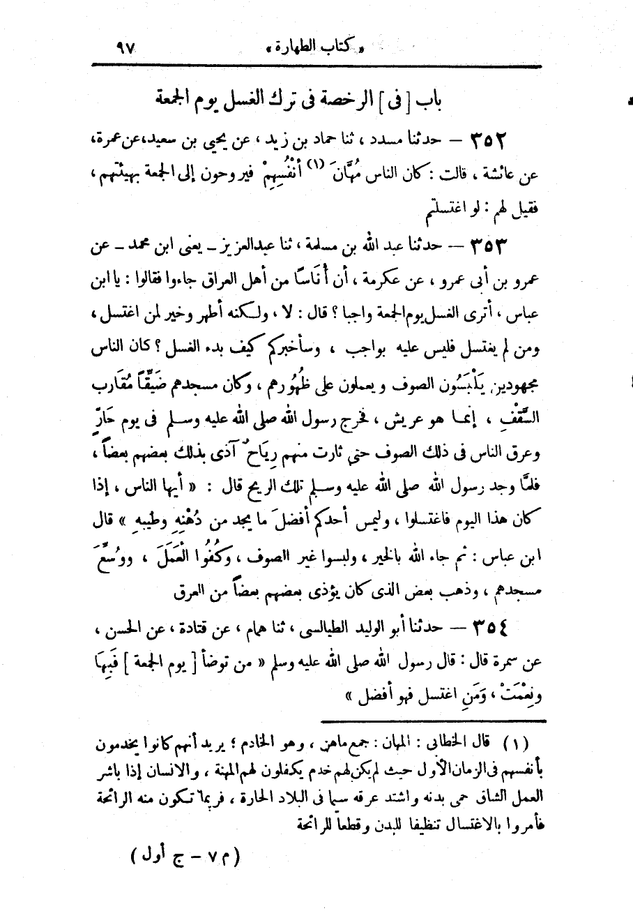 353 - حَدَّثَنَا عَبْدُ اللَّهِ بْنُ مَسْلَمَةَ، حَدَّثَنَا عَبْدُ الْعَزِيزِ يَعْنِي ابْنَ مُحَمَّدٍ، عَنْ عَمْرِو بْنِ أَبِي عَمْرٍو، عَنْ عِكْرِمَةَ، أَنَّ أُنَاسًا مِنْ أَهْلِ الْعِرَاقِ جَاءُوا فَقَالُوا: يَا ابْنَ عَبَّاسٍ أَتَرَى الْغُسْلَ يَوْمَ الْجُمُعَةِ وَاجِبًا؟ قَالَ: لَا، وَلَكِنَّهُ أَطْهَرُ، وَخَيْرٌ لِمَنِ اغْتَسَلَ، وَمَنْ لَمْ يَغْتَسِلْ فَلَيْسَ عَلَيْهِ بِوَاجِبٍ، وَسَأُخْبِرُكُمْ كَيْفَ بَدْءُ الْغُسْلِ كَانَ النَّاسُ مَجْهُودِينَ يَلْبَسُونَ الصُّوفَ وَيَعْمَلُونَ عَلَى ظُهُورِهِمْ، وَكَانَ مَسْجِدُهُمْ ضَيِّقًا مُقَارِبَ السَّقْفِ - إِنَّمَا هُوَ عَرِيشٌ - فَخَرَجَ رَسُولُ اللَّهِ صَلَّى اللهُ عَلَيْهِ وَسَلَّمَ فِي يَوْمٍ حَارٍّ وَعَرِقَ النَّاسُ فِي ذَلِكَ الصُّوفِ حَتَّى ثَارَتْ مِنْهُمْ رِيَاحٌ آذَى بِذَلِكَ بَعْضُهُمْ بَعْضًا، فَلَمَّا وَجَدَ رَسُولُ اللَّهِ صَلَّى اللهُ عَلَيْهِ وَسَلَّمَ تِلْكَ الرِّيحَ قَالَ: «أَيُّهَا النَّاسُ إِذَا كَانَ §هَذَا الْيَوْمَ فَاغْتَسِلُوا، وَلْيَمَسَّ أَحَدُكُمْ أَفْضَلَ مَا يَجِدُ مِنْ دُهْنِهِ وَطِيبِهِ» قَالَ ابْنُ عَبَّاسٍ: ثُمَّ جَاءَ اللَّهُ بِالْخَيْرِ وَلَبِسُوا غَيْرَ الصُّوفِ، وَكُفُوا الْعَمَلَ وَوُسِّعَ مَسْجِدُهُمْ، وَذَهَبَ بَعْضُ الَّذِي كَانَ يُؤْذِي بَعْضُهُمْ بَعْضًا مِنَ الْعَرَقِ