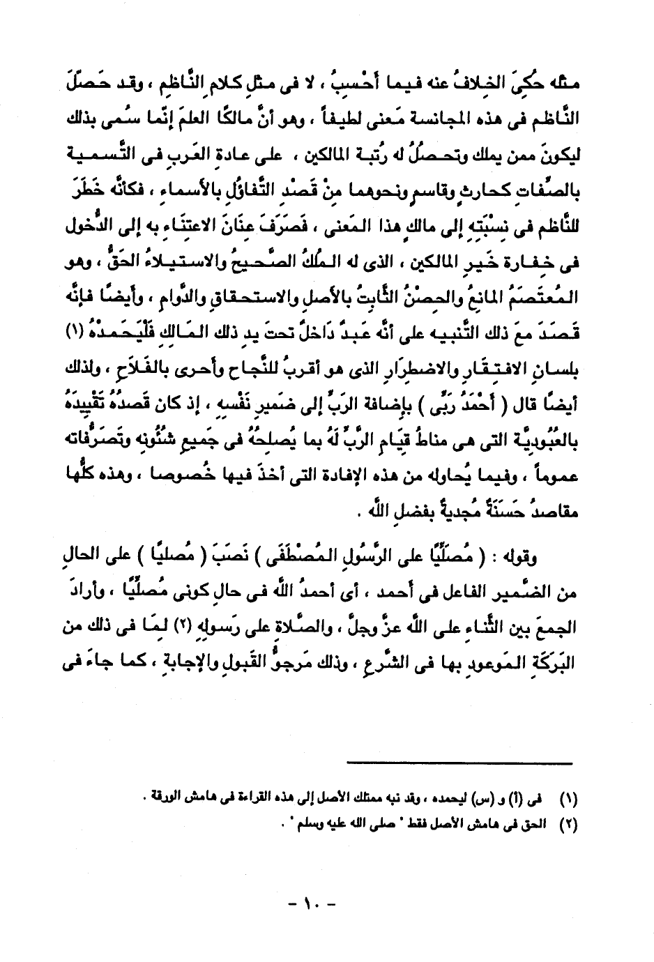 مثله حكي الخلاف عنه فيما أحسب، لا في مثل كلام الناظم، وقد حصل الناظم في مثل هذه المجانسة معنى لطيفا، وهو أن مالكا العلمَ إنما سمي بذلك ليكون ممن يملك وتحصل له رتبة المالكين، على عادة العربي في التسمية بالصفات كحارث وقاسم ونحوهما من قصد التفاؤل بالأسماء، فكأنه خطر للناظم في نسبته إلى مالك هذا المعنى، فصرف عنان الاعتناء به إلى الدخول في خفارة خير المالكين، الذي له الملك الصحيح والاستيلاء الحق، وهو المعتصم المانع والحصن الثابت بالأصل والاستحقاق والدوام، وأيضا فإنه قصد مع ذلك التنبيه على أنه عبد داخل تحت يد ذلك المالك فليحمده بلسان الافتقار والاضطرار الذي هو أقرب للنجاح وأحرى بالفلاح، ولذلك أيضا قال (أحمد ربي) بإضافة الرب إلى ضمير نفسه، إذا كان قصده تقييده بالعبودية التي هي مناط قيام الرب له بما يصلحه في جميع شئون وتصرفاته عموما، وفيما يحاوله من هذه الإفادة التي أخذ فيها خصوصا، وهذه كلها مقاصد حسنة مجدية بفضل الله.