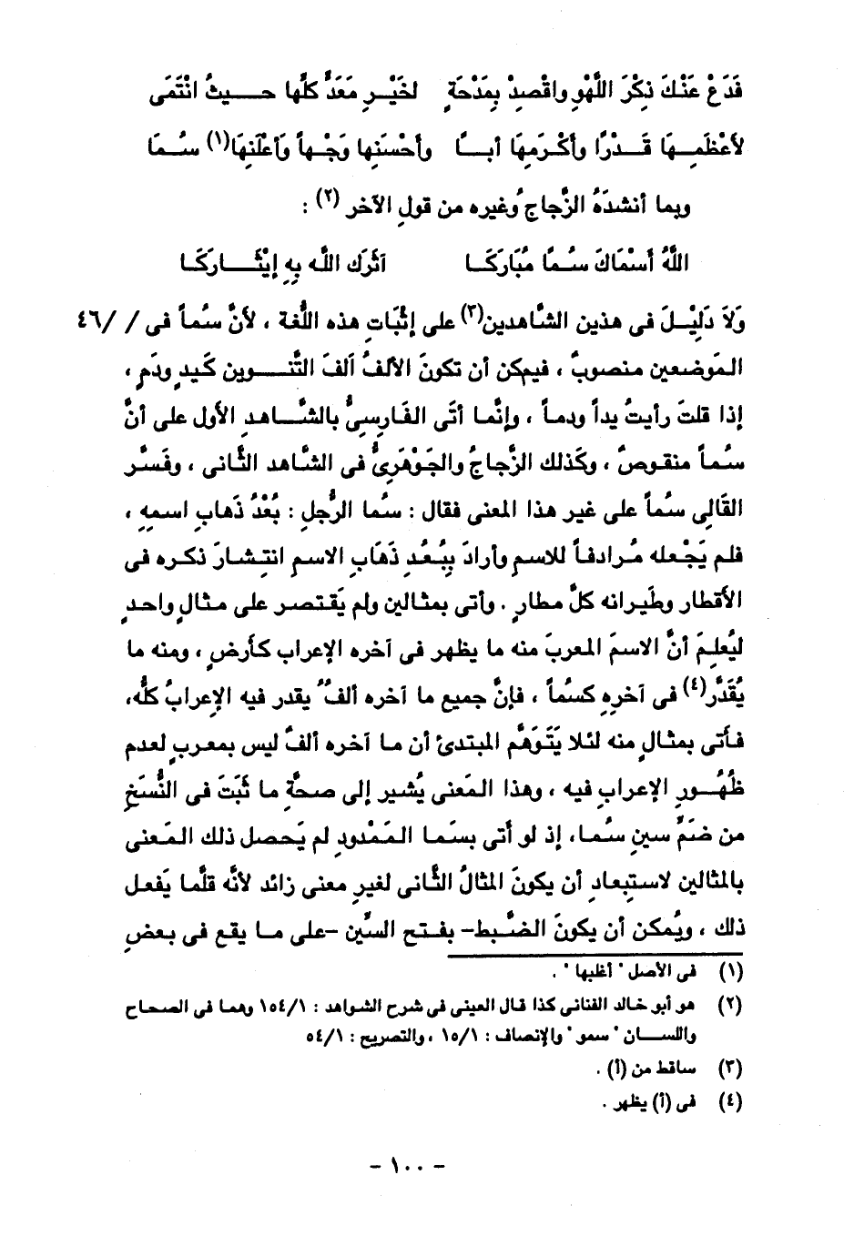 ولا دليل في هذين الشاهدين على إثبات هذه اللغة، لأن سُما في الموضعين منصوب، فيم كن أن تكون الألف ألف التنوين كيد ودم، إذا قلت رأيت يدا ودما، وإنما أتى الفارسي بالشاهد الأول على أن سُما منقوص، وكذلك الزجاج والجوهري في الشاهد الثاني، وفسر القالي سُما على غير هذا المعنى فقال: سُما الرجل: بعد ذهاب اسمه، فلم يجعله مرادفا للاسم وأراد ببعد ذهاب الاسم انتشار ذكره في الأقطار وطيرانه كل مطار. وأتى بمثالين ولم يقتصر على مثال واحد ليعلم أن الاسم المعرب منه ما يظهر في آخره الإعراب كأرض، ومنه ما يقدر في آخره كسُما، فإن جميع ما آخره ألف ليس بمعرب لعدم ظهور الإعراب فيه، وهذا المعنى يشير إلى صحة ما ثبت في النسخ من ضم السين سُما، إذ لو أتى بسَما الممدود لم يحصل ذلك المعنى بالمثالين لاستبعاد أن يكون المثال الثاني لغير معنى زائد لأنه قلما يفعل ذلك، ويمكن أن يكون الضبط -بفتح السين- على ما يقع في بعض