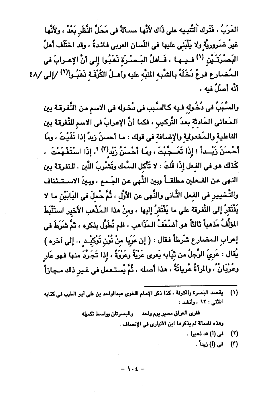 العرب، فترك التنبيه على ذاك لنها مسألة في محل النظر بعد، ولأنها غير ضرورية ولا ينبني ليها في اللسان العربي فائدة، وقد اختلف أهل البصرتين فيها، فأهل البصرة ذهبوا غلى أن الإعراب في المضارع فرع دخله بالشبه المنبه عليه وأهل الكوفة ذهبوا غلى أنه أصل فيه، والسبب في دخوله فيها كالسبب في دخوله في الاسم من التفرقة بين المعاني الحادثة بعد التركيب، فكما أن الإعراب في الاسم للتفرقة بين الفاعلية والمفعولية والإضافة في قولك: ما أحسن زيدٌ إذا نفيت، وما أحسن زيدا! إذا تعجبت، وما أحسن زيدٍ؟ إذا استفهمت، كذلك هو في الفعل إذا قلت: لا تأكل السمك وتشرب اللبن. للتفرقة بين النهي عن الفعلين مطلقا وبين النهي عن الجمع، وبين الاستئناف والتخيير في الفعل الثاني والنهي عن الأول، ثم حمل في البابين ما لا يفتقر إلى التفرقة على ما يفتقر غليها، ومن هذا المذهب الأخير استنبط المؤلف مذهبا ثالثا هو أضعف المذاهب، فلم نطوّل بذكره، ثم شرط في إعراب المضارع شرطا فقال: (إن عريا من نون التوكيد .. إلى آخره) يقال: عري الرجل من ثيابه يعري عرية وعرْوة، إذا تجرد منها فهو عار وعريان، والمرأة عريانة، هذا أصله، ثم يستعمل في غير ذلك مجازًا