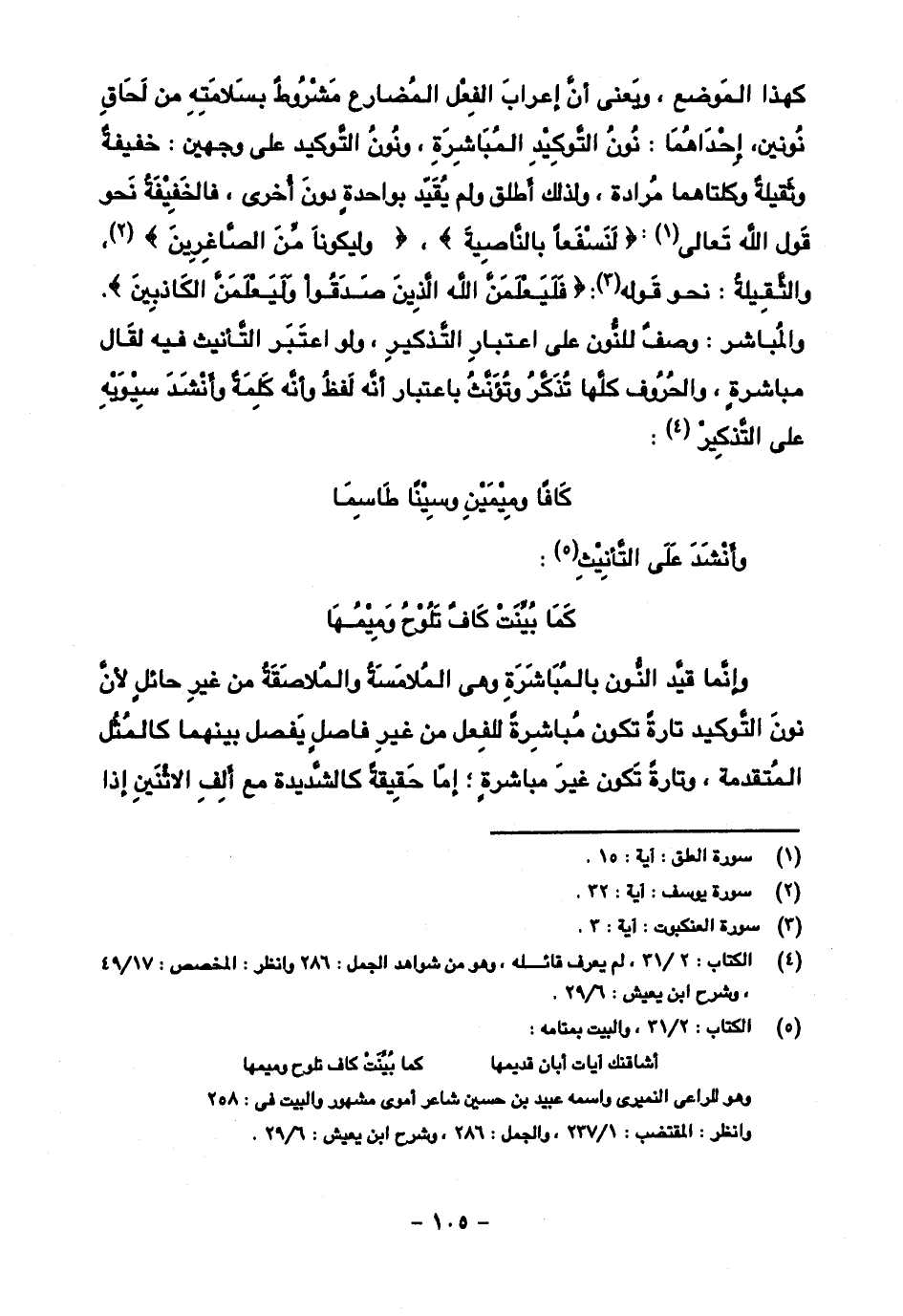 كهذا الموضع، ويعني أن إعراب الفعل المضارع مشروط بسلامته من لحاق نونين، إحداهما: نون التوكيد المباشرة، ونون التوكيد على وجهين: خفيفة وثقيلة وكلتاهما مرادة، ولذلك أطلق زلم يقيد بواحدة دون أخرى، فالخفيفة نحو قول الله تعالى: ((لنسفعا بالناصية))، ((وليكونا من الصاغرين))، والثقيلة: نحو قوله: ((فليعلمن الله الذين صدقوا وليعلمن الكاذبين))، والمباشر: وصف للنون على اعتبار التذكير، ولو اعتبر التأنيث فيه لقال مباشرة، والحروف كلها تذكر وتؤنث باعتبار أنه لفظ وأنه كلمة وأنشد سيبويه على التذكير: