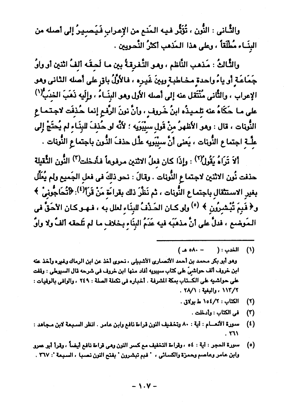 ألا تراه يقول: وإذا كان فعل الاثنين مرفوعا فأدخلت النون الثقيلة حذفت نون الاثنين لاجتماع النونات. وقال: نحو ذلك في فعل الجميع ولم يعلل بغير الاستثقال باجتماع النونات، ثم نظر ذلك بقراءة من قرأ: ((أتحاجوني)) و ((فيم تبشرون)) ول كان الحذف للبناء لعلل به، فهو كان الأحق في الموضع، فدل على أن مذهبه فيه عدم البناء بخلاف ما لم تلحقه ألف ولا واو