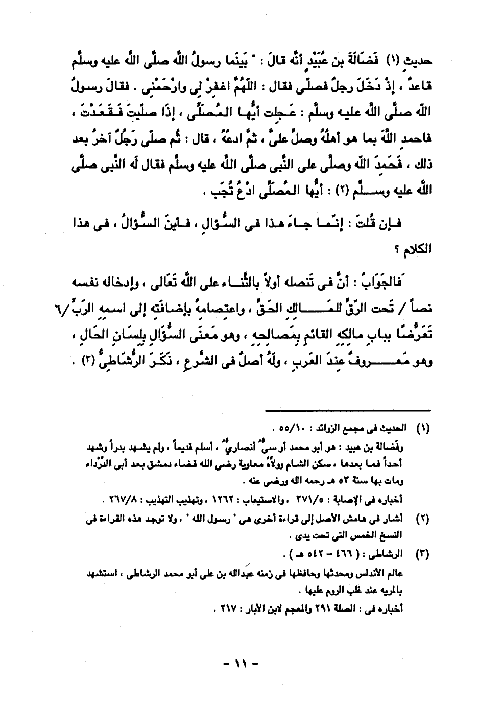 حديث فضالة بن عبيد أنه قال: بينما رسول الله صلى الله عليه وسلم قاعد، إذ دخل رجل فصلى فقال: اللهم اغفر لي وارحمني، فقال رسول الله صلى الله عليه وسلم: عجلت أيها المصلي، إذا صليت فقعدت، فاحمد الله بما هو أهله وصل عليه، ثم ادعه، قال: ثم صلى رجل آخر بعد ذلك، فحمد الله وصلى على النبي صلى الله عليه وسلم فقال له النبي صلى الله عليه وسلم: أيها المصلي ادعُ تُجَب.