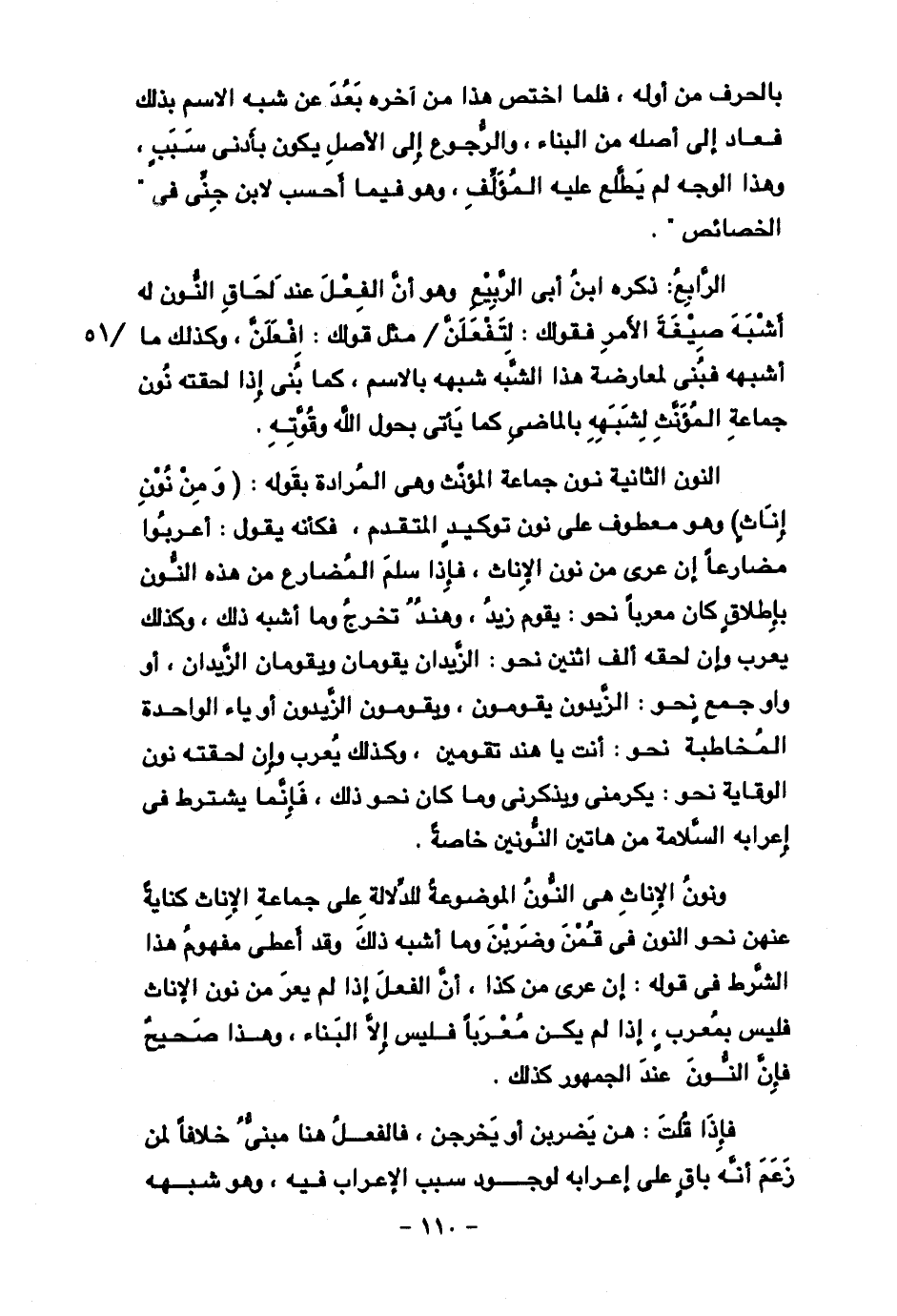 ونون الإناث هي النون الموضوعة للدلالة على جماعة الإناث كناية عنهن نحو انون في قُمن وضربن وما أشبه ذلك وقد أعطى مفهوم هذا الشرط في قوله: إن عرى من كذا، أن الفعل إذا لم يعر من نون الإناث فليس بمعرب، إذا لم يكن معربا فليس إلا البناء، وهذا صحيح فإن النون عند الجمهور كذلك.