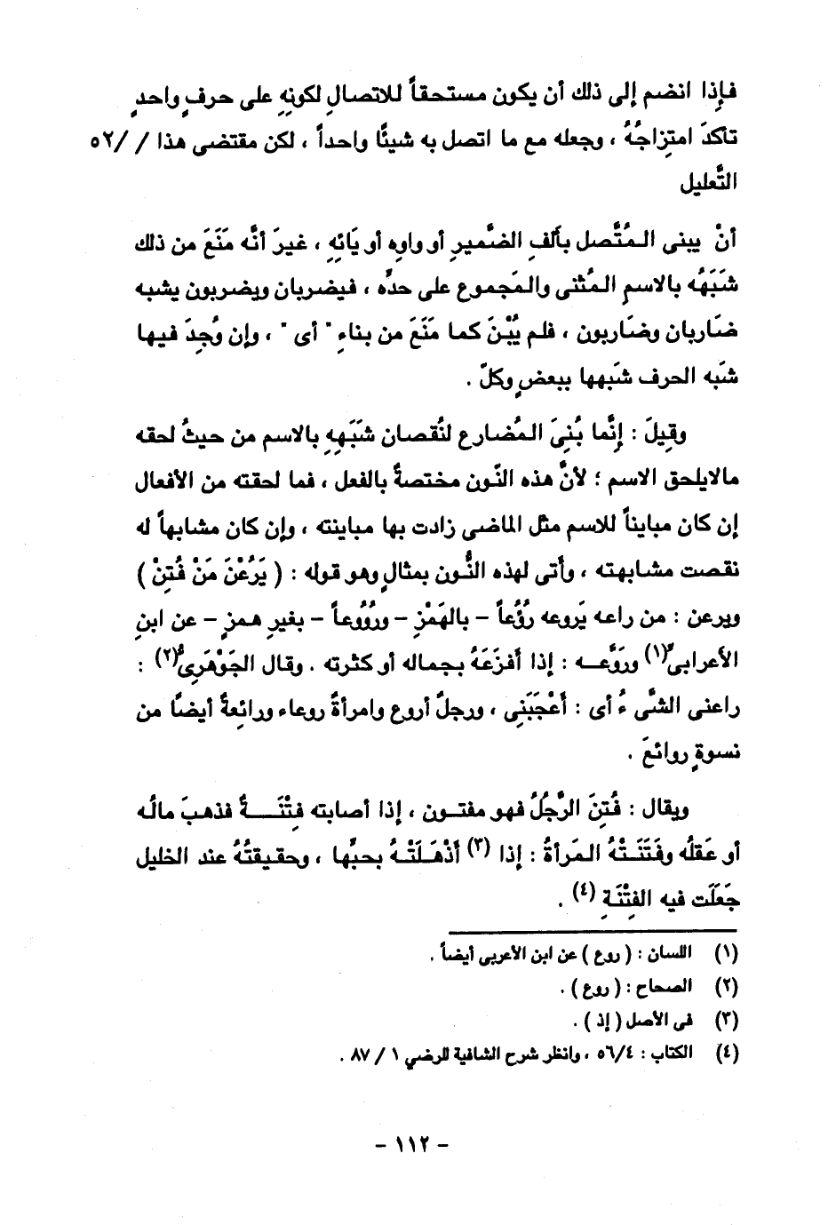 وقيل إنما بُنِيَ المضارع لنقصنا شَبَهِهِ بالاسم من حيث لحقه ملا يلحق الاسم؛ لأن هذه النون مختصة بالفعل. فما لحقته من الأفعال إن كان مباينًا للاسم مثل الماضي زادت بهام باينته, وإن كان مشابهًا له نقصت مشابهته, وأتى لهذه النون بمثال وهو قوله: (يَرُعْنَ من فُتِن) ويَرُعْنَ: من راعه يروعه رُؤعًا -بالهمز- ورووعًا -بغير همز- عن ابن الأعرابي ورَوَّعه: إذا أفزعه بجماله وكثرته. قال الجوهري: راعني الشيء أي أعجبني , ورجلٌ أروع وامرأة روعاء ورائعة أيضًا من نسوة روائع.