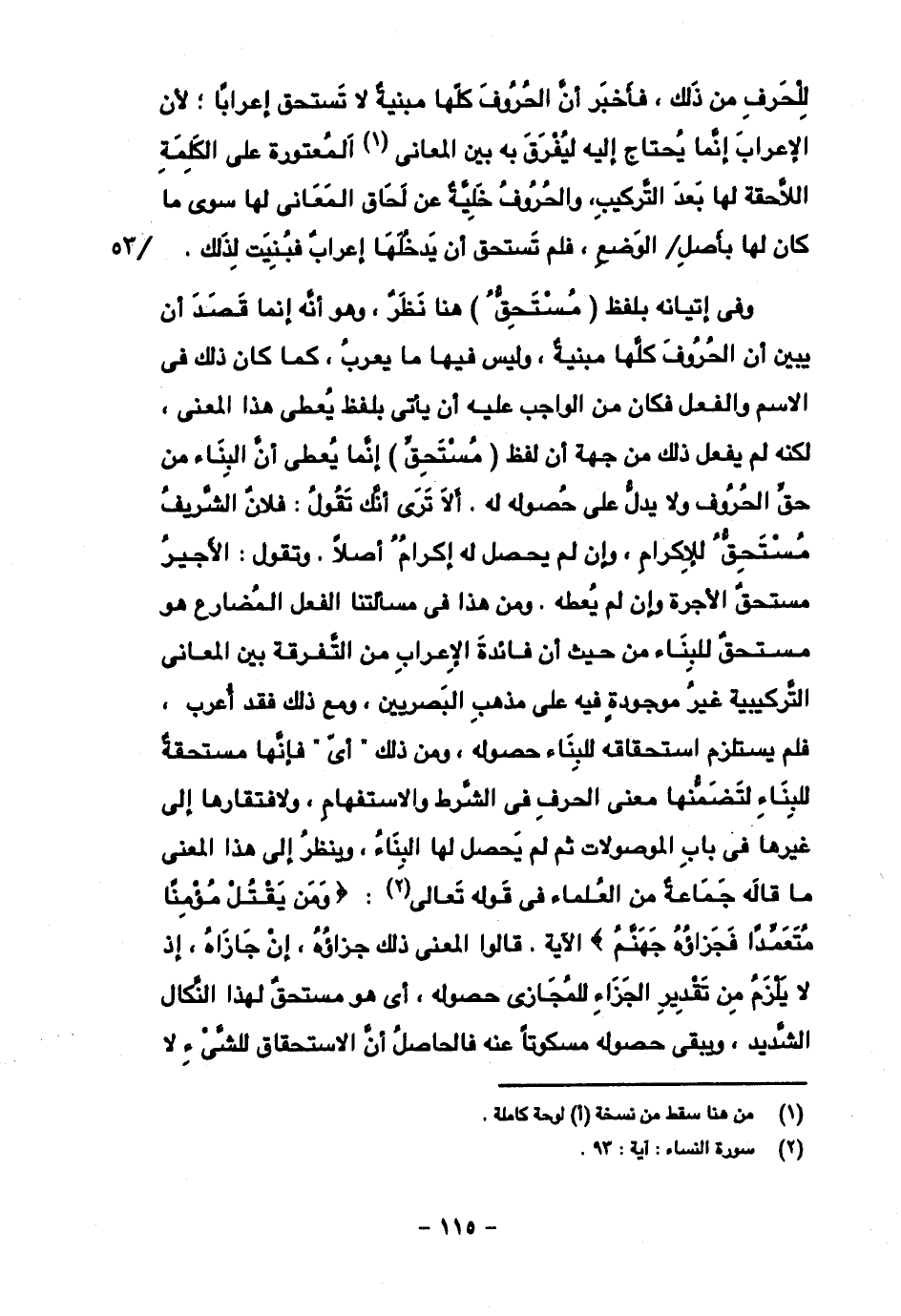 وفي إتيانه بلفظ (مُستحِقٌ) هنا نَظَرٌ, وهو أنه إنما قَصَدَ أن يبين أن الحروف كلها مبنية, وليس فيها ما يعرب, كما كان ذلك في الاسم والفعل فكان الواجب عليه أن يأتي بلفظ يُعطي هذا المعنى, لكنه لم يفعل ذلك من جهة أن لفظ (مُستحِقٌ) إنما يُعطي أن البناء من حق الحروف ولا يدل حصوله له. ألا ترى أنك تقول: فلانٌ الشريف مُستحِقٌ للإكرام, وإن لم يحصل إكرامٌ أصلًا, وتقول الأجير مُستحِقٌ الأجرة وإن يُعطه. ومن هذا مسألتنا الفعل المضارع هو مستحق للبناء من حيث أن فائدة الإعراب من التفرقة بين المعاني التركيبية غير موجودة فيه على مذهب البصريين, ومع ذلك فقد أُعرب. فلم يستلزم استحقاقه للبناء حصوله, ومن ذلك "أي" فإنها مستحقةٌ للبناء لتضمنها معنى الحرف في الشرط والاستفهام , ولافتقارها إلى غيرها في باب الموصولات ثم لم يحصل لها البناء, وينظر إلى هذا المعنى ما قاله جماعة من العلماء في قوله تعالى: (وَمَنْ يَقْتُلْ مُؤمِنًا مُتَعمِّدًا فَجَزَؤُه جَهَنَّمُ) الآية. قالوا المعنى ذلك جزاؤه, إن جازاه, إذ لا يلزم من تقدير الجزاء للمُجازي حصوله, أي هو مستحق لهذا النكال الشديد, ويبقى حصوله مسكوتًا عنه فالحاصل أن الاستحقاق للشيء لا