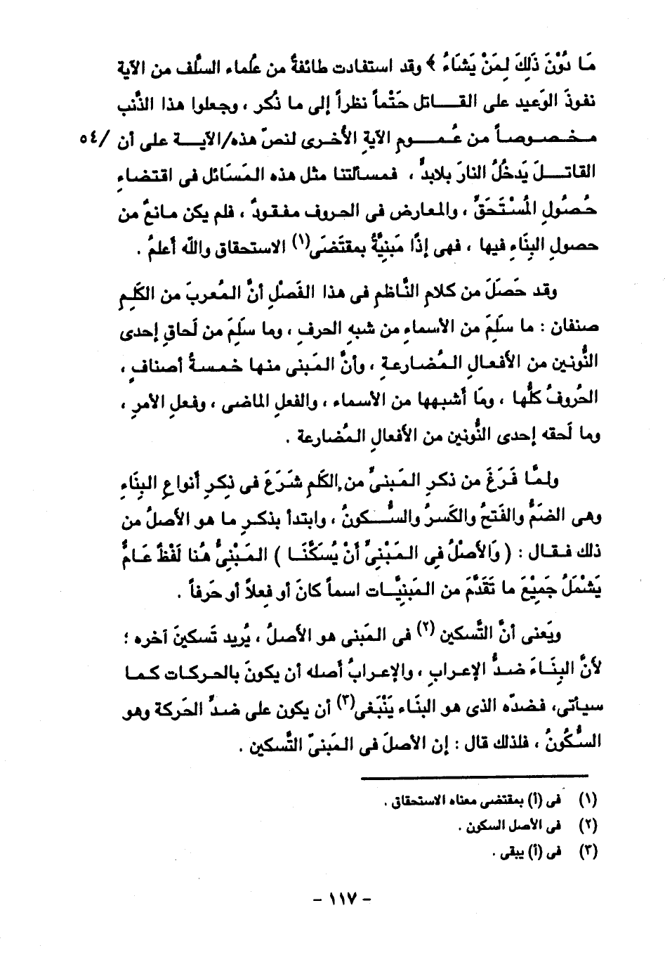 ما دون ذلك لمن يشاء)) وقد استفادت طائفة من علماء السلف من الآية نفوذ الوعيد على القاتل حتما نظرا إلى ما ذكر، وجعلوا هذا الذنب مخصوصا من عموم الآية الأخرى لنص هذه الآية على أن القاتل يدخل النار بلابد، فمسألتنا مثل هذه المسائل في اقتضاء حصول المستحق، والمعارض في الحروف مفقود، فلم يكن مانع من حصول البناء فيها، فهي إذا مبنية بمقتضى الاستحقاق والله أعلم.