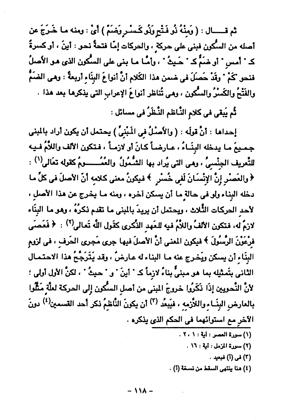 إحداها: أن قوله: (والأصل في المبنى) يحتمل أن يكون أراد بالمبنى جميع ما يدخله البناء، عارضا كان أو ازما، فتكون الألف واللام فيه للتعريف الجنسي، وهي التي يراد بها الشمول والعموم كقوله: ((والعصر إن الإنسان لفي خسر)) فيكون معنى كلامه أن الأصل في كل ما دخله البناء ولو في الة ما أن يسكن آخره، ومنه ما يخرج عن هذا الأصل، لأحد الحركات الثلاث، ويحتمل أن يريد بالمبنى ما تقدم ذكره، وهو ما البناء لازم له، فتكون الألف واللام فيه للعهد الذكرى كقول الله تعالى: ((فعصى فرعون الرسول)) فيكون المعنى أن الأصل فيها جرى مجرى الحرف، في لزوم البناء أن يسكن ويخرج عنه ما البناء له عارض، وقد يترجح هذا الاحتمال الثاني بتميله بما هو مبنى بناء لازما كـ "أين" و "حيث"، لكن الأولى أولى؛ لن النحويين إذا ذكروا خروج المبنى من أصل السكون إلى الحركة لعلة مثلوا بالعارض البناء واللازمة، فيبعد أن يكون الناظم ذكر أحد القسمين دون الآخر مع استوائهما في الحكم الذي يذكره.
