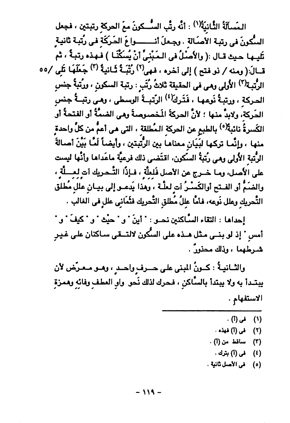 المسألة الثانية: أنه رتب السكون مع الحركة رتبتين، فجعل السكون في رتبة الأصالة، وجعل أنواع الحركة في رتبة ثانية تليها قال: (والأصل في المبنى أن يسكّنا) فهذه رتبة، ثم قال: (ومنه ذو فتح) غلى آخره، فهي رتبة ثانية جعلها تلي الرتبة الأوى وهي في الحقيقة ثلاث رتب: رتبة السكون، ورتبة جنس الحركة، ورتبة نوعها، فترك الرتبة الوسطى، وهي رتبة جنس الحركة، ولا بد منها؛ لأن الحركة المخصوصة وهي الضمة أو الفتحة أو الكسرة نائبة بالطبع عن الحركة المطلقة، التي هي أعم من كل واحدة منها، وإنما تركها لبيان معناها بين الرتبتين، وأيضا لما بين أصالة الرتبة الأولى وهي رتبة السكون، اقتضى ذلك فرعية ما عداها وأنها ليست على الأصل، وما خرج عن الأصل فلعله، فإذا التحريك آت لعلة، والضم أو الفتح أو الكسر آت لعلة، وهذا يدعو إلى بيان علل مطلق التحريك وعلل نوعه، فأما علل مطلق التحريك فثماني علل في الغالب.