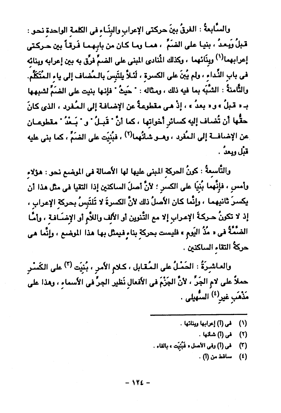 والسابعة: الفرق بين حركتي الإعراب والبناء في الكلمة الواحدة نحو: قبل وبعد، بنيا على الضم، هما وما كان من بابهما فرقا بين حركتي إعرابهما وبنائهما، وكذلك المنادى المبني على الضم فرق به بين إعرابه وبنائه في باب النداء، ولم يبن على الكسرة، لئلا يلتبس بالمضاف إلى ياء المتكلم. والثامنة: الشبه بما فيه ذلك، ومثاله: "حيث" فإنها بنيت على الضم لشبهها بـ "قبل" و "بعد" إذ هي مقطوعة عن الإضافة إلى المفرد، الذي كان حقها أن تضاف إليه كسائر أخواتها، كما أن "قبل" و "بعد" مقطوعان عن الإضافة إلى المفرد، وهو شأنهما، فبنيت على الضم كما بنى عليه قبل وبعد.