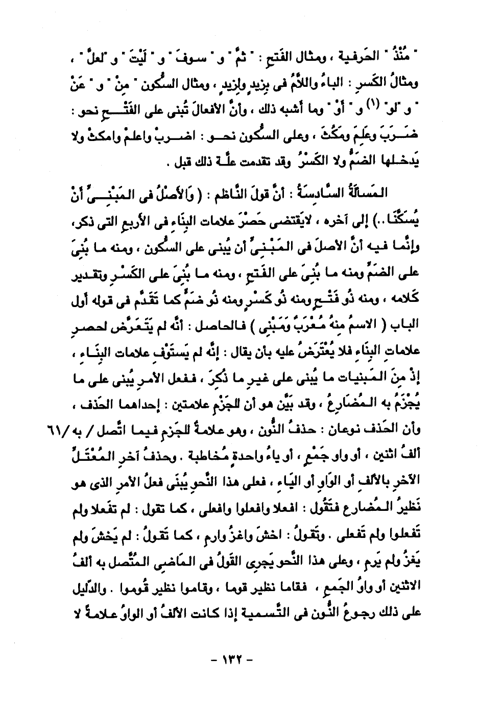المسألة السادسة: أن قول الناظم: (والأصل في المبنى أن يسكنا .. ) إلى آخره، لا يقتضي حصر علامات البناء في الأربع التي ذكر، وإنما فيه أن الأصل في المبنى أن يبنى على السكون، ومنه ما بنى على الضم ومنه ما بني على الفتح، ومنه ما بني على الكسر وتقدير كلامه، ومنه ذو فتح ومنه ذو كسر ومنه ذو ضم كما تقدم في قوله أول الباب (الاسم منه معرب ومبني) فالحاصل: أنه لم يستوقف علامات البناء، إذ من المبنيات ما يبنى على غير ما ذكر، ففعل الأمر يبنى على ما يجزم به المضارع، وقد بين هو أن للجزم علامتين: إحداهما الحذف، وأن الحذف نوعان: حذف النون، وهو علامة للجزم فيما اتصل به ألف اثنين، أو واو جمع، أو ياء واحدة مخاطبة. وحذف آخر المعتل الآخر بالألف أو الواو أو الياء، فعلى هذا النحو يبنى فعل الأمر الذي هو نظير المضارع فتقول: افعلا وافعلوا وافعلي، كما تقول: لم تفعلا ولم تفعلوا ولم تفعلي، . وتقول: اخش واغز وارم، كما تقول: لم يخش ولم يغز ولم يرم، وعلى هذا النحو يجري القول في الماضي المتصل به ألف الاثنين أو واو الجمع، فقاما نظير قوما، وقاموا نظير قوموا. والدليل على ذلك رجوع النون في التسمية إذا كانت الألف أو الواو علامة لا