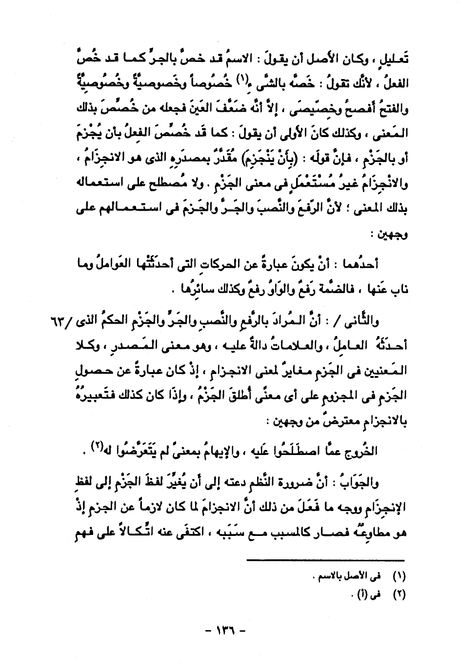 والثاني: أن المراد بالرفع والنصب والجر والجزم الحكم الذي أحدثه العامل، والعلامات دالة عليه، وهو معنى المصدر، وكلا المعنيين في في الجزم مغاير لمعنى الانجزام، إذ كان عبارة عن حصول الجزم في المجزوم على أي معنى أطلق الجزم، وإذا كان كذلك فتعبيره بالانجزام معترض من وجهين: