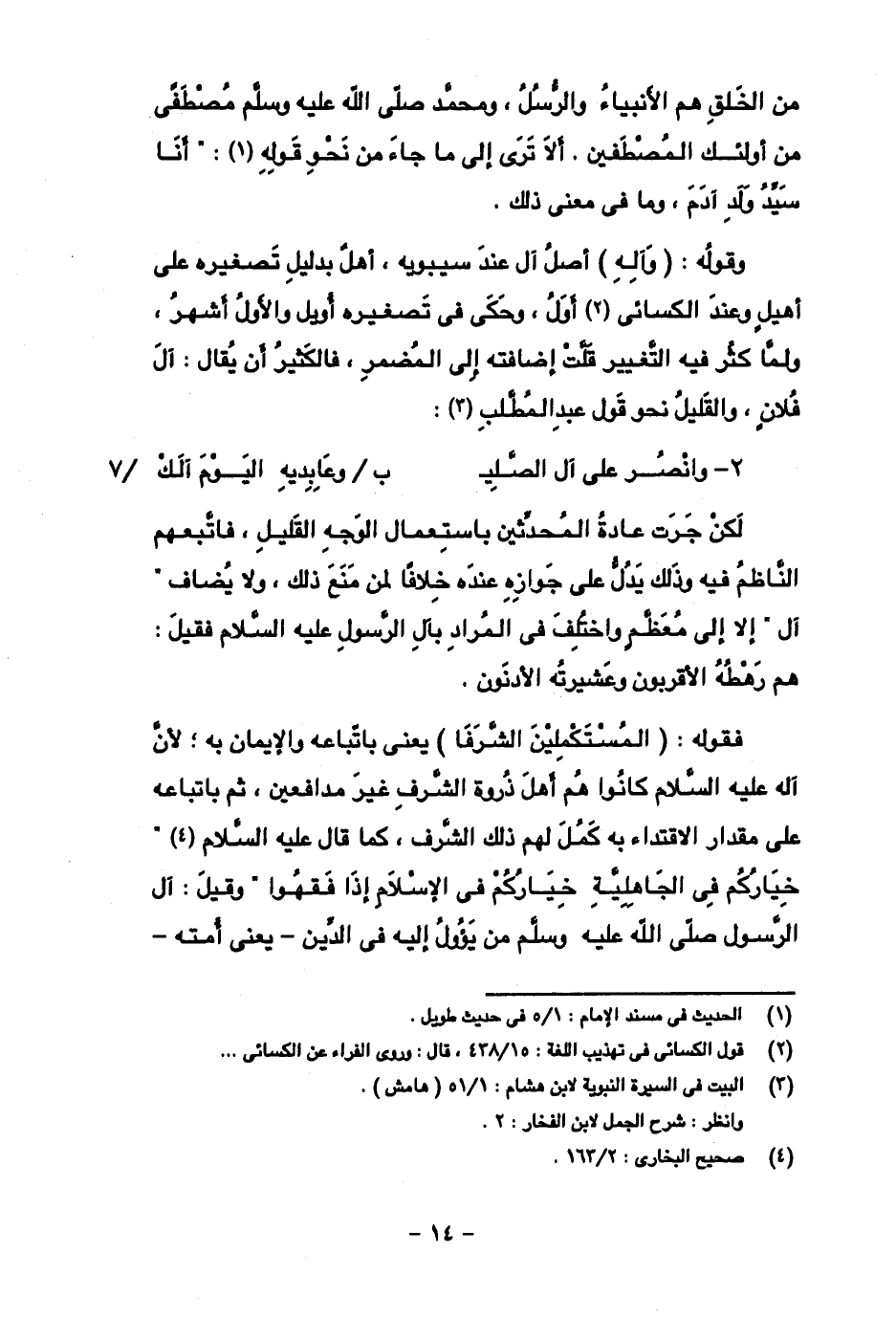 لكن جرت عادة المحدثين باستعمال الوجه القليل، فاتبعهم الناظم فيه وذلك يدل على جوازه عنده خلافا لمن منع ذلك، ولا يضاف "آل" إلا إلى مُعَظّم واختلف المراد بآل الرسول عليه السلام فقيل: هم رهطه الأقربون وعشيرته الأدنون.