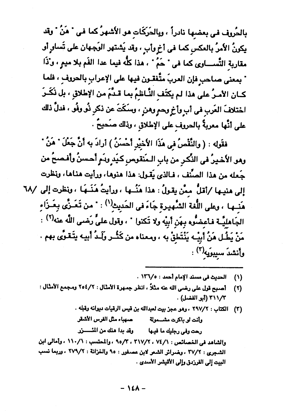 فقوله: (والنقص في هذا الأخير أحسن) أراد به أن جعل "هن" وهو الأخير في الذكر من باب المنقوص كيد ودم أحسن وأفصح من جعله من هذا الصنف، فالذي يقول: هذا هنوها، ورأيت هناها، ونظرت إلى هنيها/ أقل ممن يقول: هذا هنها، ورأيت هنها، ونظرت إلى هنها، وعلى اللغة الشهيرة جاء في الحديث: "من تعزى بعزاء الجاهلية فأعضوه بهن أبيه ولا تكنوا"، وقول علي رضي الله عنه: من يطل هن أبيه ينتطق به، ومعناه من كثر ولد أبيه يتقوى بهم.