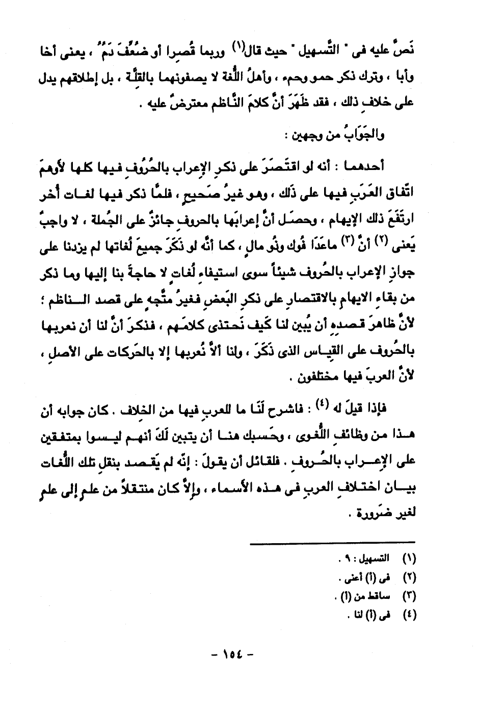 فإذا قيل له: فاشرح لنا ما للعرب فيها من الخلاف. كان جوابه أن هذا من وظائف اللغوي، وحسبك هنا أن يتبين لك أنهم ليسوا بمتفقين على الإعراب بالحروف. فلقائل أن يقول: إن لم يقصده بنقل تلك اللغات بيان اختلاف العرب في هذه الأسماء، وإلا كان متنقلا من علم إلى علم لغير ضرورة.