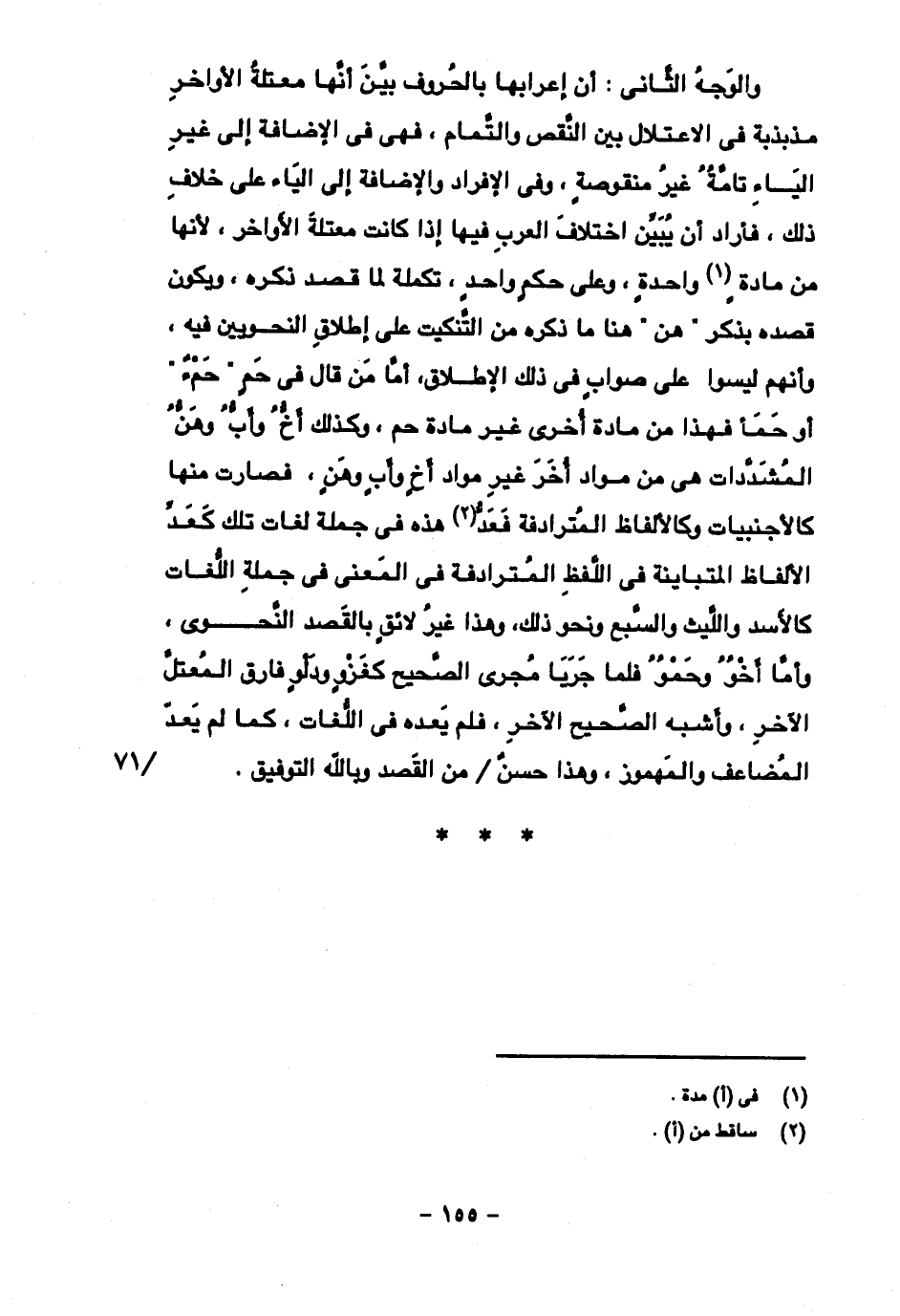 والوجه الثاني: أن إعرابها بالحروف بين أنها معتلة الأواخر مذبذبة في الاعتلال بين النقص والتمام، فهي في الإضافة إلى غير الياء تامة غير منقوصة، وفي الإفراد والإضافة إلى الياء على خلاف ذلك، فأراد أن يبين اختلاف العرب فيها إذا كانت معتلة الأواخر، لأنها من مادة واحدة، وعلى حكم واحد، تكملة لما قصد ذكره، ويكون قصده بذكر "هن" هنا ما ذكره من التنكيت على إطلاق النحويين فيه، وأنهم ليسوا على صواب في ذلك الإطلاق، أما من قال في حم "حمء" أو حمأ فهذا من مادة أخرى غير مادة حم، وكذلك أخ وأب وهن المشددات هي من مواد أخر غير مواد أخ وأب وهن، فصارت منها كالأجنبيات وكالألفاظ المترادفة فعد هذه في جملة لغات تلك كعد الألفاظ المتباينة في اللفظ المترادفة في المعنى في جملة اللغات كالأسد والليث والسبع ونحو ذلك، وهذا غير لائق بالقصد النحوي، وأما أخو وحمو فلما جريا مجرى الصحي كغزو ودلو فارق المعتل الآخر، وأشبه الصحيح الآخر، فلم يعده في اللغات، كما لم يعد المضاعف والمهموز، وهذا حسن من القصد وبالله التوفيق.