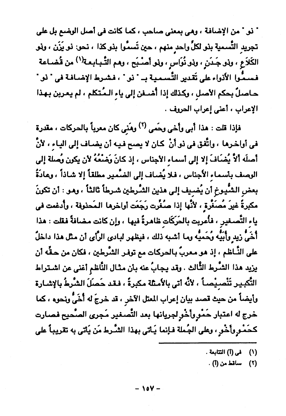 فإذا قلت: هذا أبي وأخي وحمى وهنى كان معربا بالحركات، مقدرة في أواخرها، واتفق في ذو أن كان لا يصح فيه أن يضاف غلى الياء، لأن أصله ألا يضاف إلا إلى أسماء الأجناس، إذ كان وضعه لأن يكون وصله إلى الوصف بأسماء الأجناس، فلا يضاف إلى الضمير مطلقا إلا شاذا، وعادة بعض الشيوخ أن يضيف إلى هذين الشرطين شرطا ثالثا، وهو: أن تكون مكبرة غير مصغرة، لأنها إذا صغرت رجعت أواخرها المحذوفة، وأدغمت في ياء التصغير، فأعربت بالحركات ظاهرة فيها، وإن كانت مضافة فقلت: هذا أخي زيد وأبيه وحميه وما أشبه ذلك، فيظهر لبادي الرأي أن مثل هذا داخل على الناظم، إذ هو معرب بالحركات مع تفر الشرطين، فكان من حقه أن يزيد هذا الشرط الثالث. وقد يجاب عنه بأن مثال الناظم أغنى عن اشتراط التكبير تنصيصا، لأنه أتى بالأمثلة مكبرة، فقد حصل الشرط بالإشارة وأيضا من حيث قصد بيان إعراب المعتل الآخر، قد خرج له أخي ونحوه، كما خرج له اعتبار حمو وأخو لجريانها بعد التصغير مجرى الصحيح فصارت كحمو وأخو، وعلى الجملة فإنما يأتي بهذا الشرط من يأتي به تقريباً على