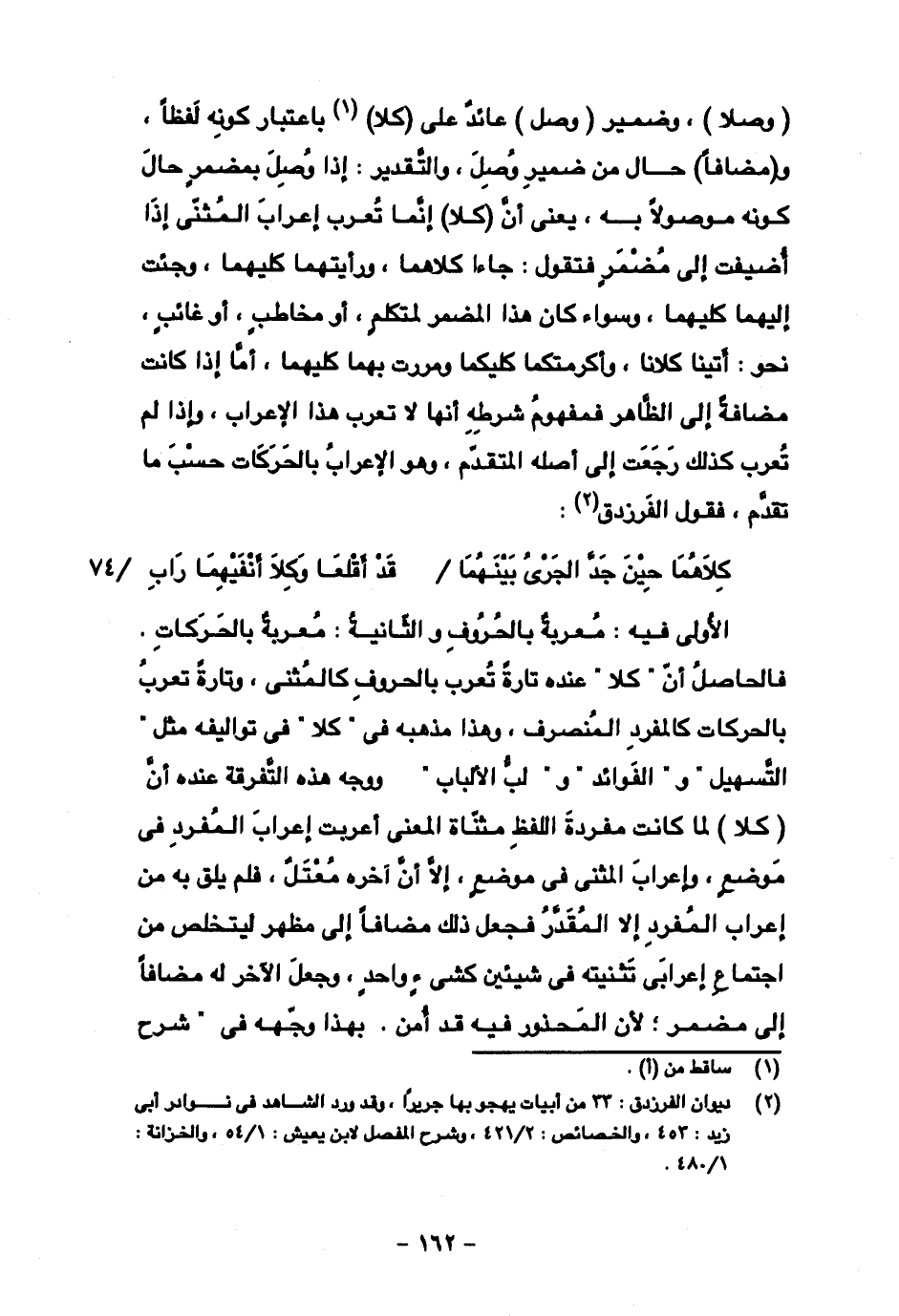الأولى فيه: معربة بالحروف والثانية: معربة بالحركات. فالحاصل أن "كلا" عنده تارة تعرب بالحروف كالمثنى، وتارة تعرب بالحركات كالمفرد المنصرف، وهذا مذهبه في "كلا" في تواليفه مثل "التسهيل" و "الفوائد" و "لبّ الألباب" ووجه هذه التفرقة عند أن (كلا) لما كانت مفردة اللفظ مثناة في موضع، إلا أن آخره معتل، فلم يلق به من إعراب المفرد إلا المقدر فجعل ذلك مضافا إلى مظهر ليتخلص من اجتماع إعرابي تثنيته في شيئين كشيء واحد، وجعل الآخر مضافا إلى مضمر؛ لأن المحذور فيه قد أمن بهذا وجّهه في "شرح