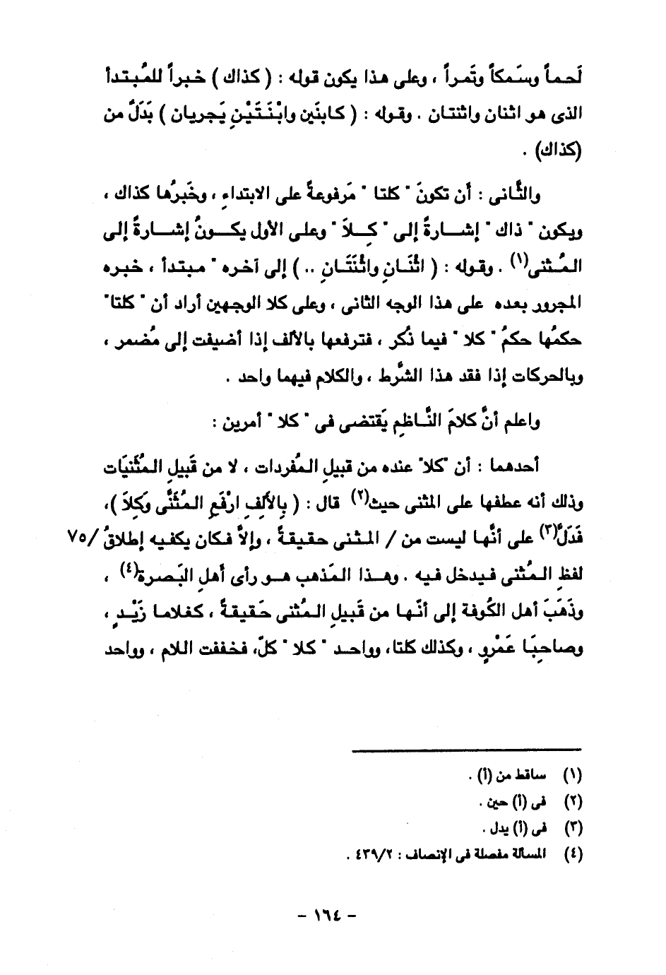 أحدهما: أن "كلا" عنده من قبيل المفردات، لا من قبيل المثنيات وذلك أنه عطفها على المثنى حيث قال: (بالألف ارفع المثنى وكلا)، فدل على أنها ليست من المثنى حقيقة، وإلا فكان يكفيه إطلاق لفظ المثنى فيدخل فيه. وهذا المذهب هو رأي أهل البصرة، وذهب أهل الكوفة إلى أنها من قبيل المثنى حقيقة، كغلاما زيد، وصاحبا عمرو، وكذلك كلتا، وواحد "كلا" كل، فخففت اللام، وواحد