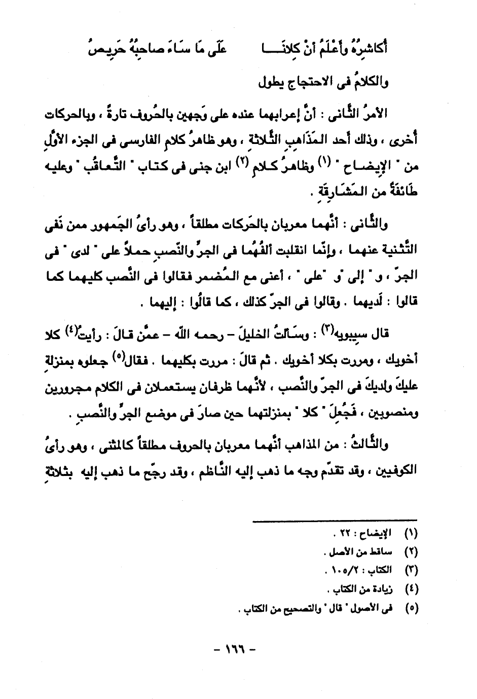 والأمر الثاني: أن إعرابهما عنده على وحين بالحروف تارة، وبالحركات أخرى، وذلك احد المذاهب الثلاثة، وهو ظاهر كلام الفارسي في الجزء الأول من "الإيضاح" وظاهر كلام ابن جني في كتاب "التعاقب" وعليه طائفة من المشارقة.