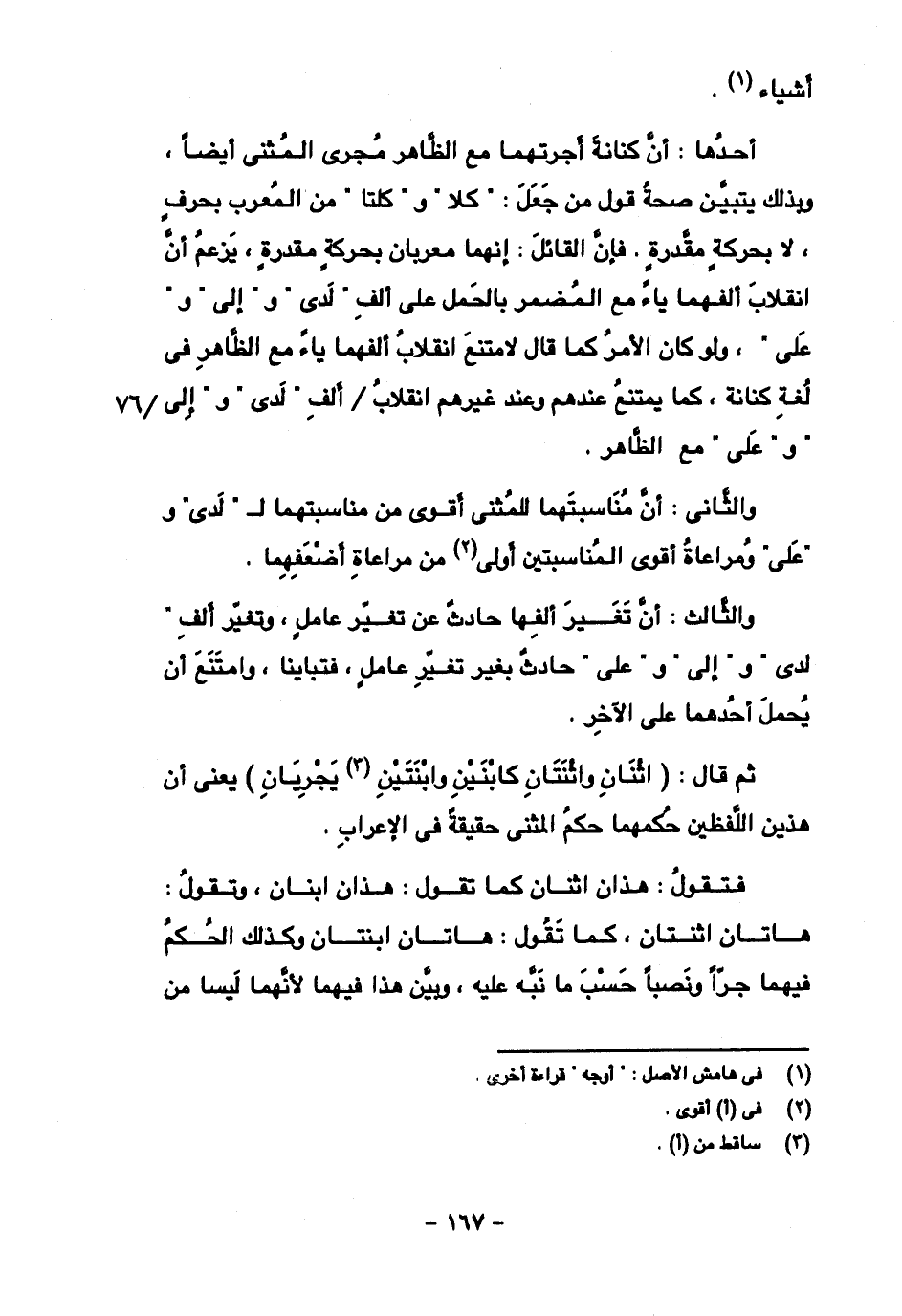 أحدها: أن كنانة أجرتهما مع الظاهر مجرى المثنى أيضا، وبذلك يتبين صحة قول من جعل: "كلا" و "كلتا" من المعرب بحرف لا بحركة مقدرة. فإن القائل: إنهما معربان بحركة مقدرة، يزعم أن انقلاب ألفهما ياء مع المضمر بالحمل على ألف "لدى" و "إلى" و "على"، ولو كان الأمر كما قال لامتنع انقلاب ألفهما ياء مع الظاهر في لغة كنانة، كما يمتنع عندهم وعند غيرهم انقلاب ألف "لدى" و "إلى" و "على" مع الظاهر.